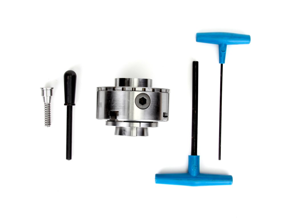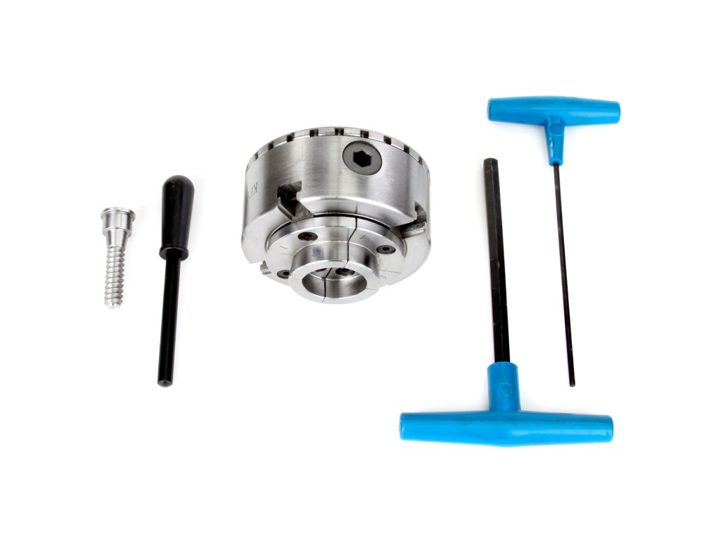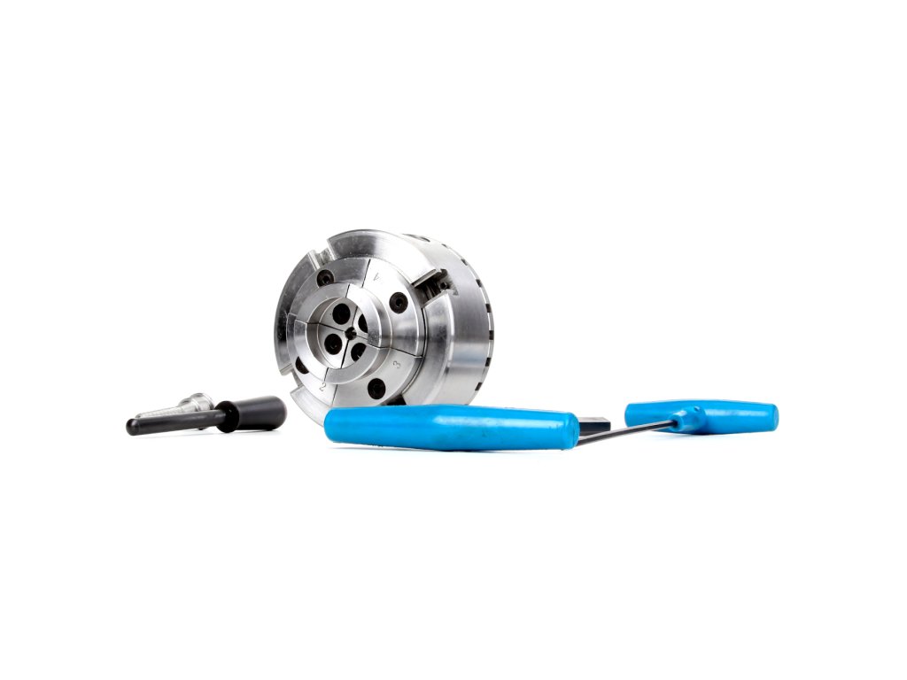 4-čeljustna koncentrična kombinirana vpenjalna glava za vpenjanje obdelovancev v območju premera A = 47 - 82 mm (notranje vpenjanje); B = 33 – 64 mm (zunanje vpenjanje). Zasnovan za stružnice z vretenastim navojem M33 × 3.5.