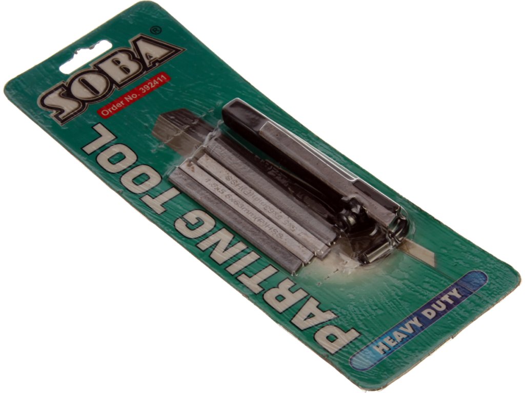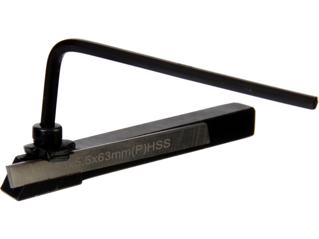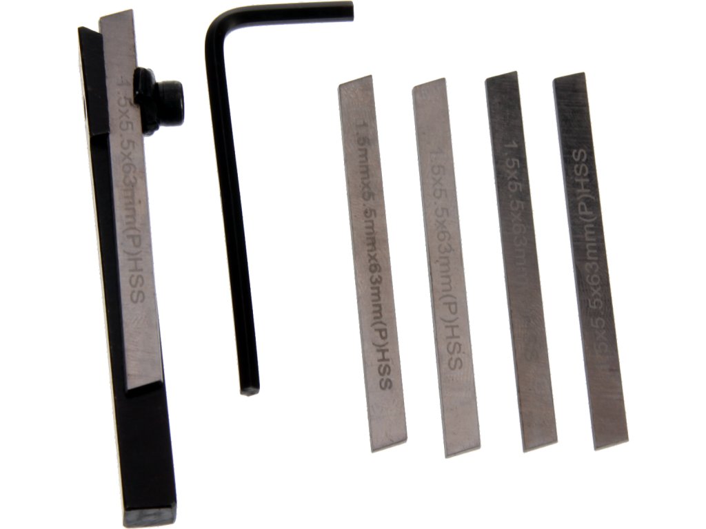Nastavljiv ločitveni nož za majhne kovinske stružnice ima dimenzije držala 8 × 8 × 80 mm, zamenljiv rezalni rob 1,5 × 5,5 × 63 mm iz hitrega jekla HSS je pritrjen v držalo z vijakom s posebno podložko. Vključen je sprostitveni ključ in 5 rezil. Pakirano v pretisnem omotu.