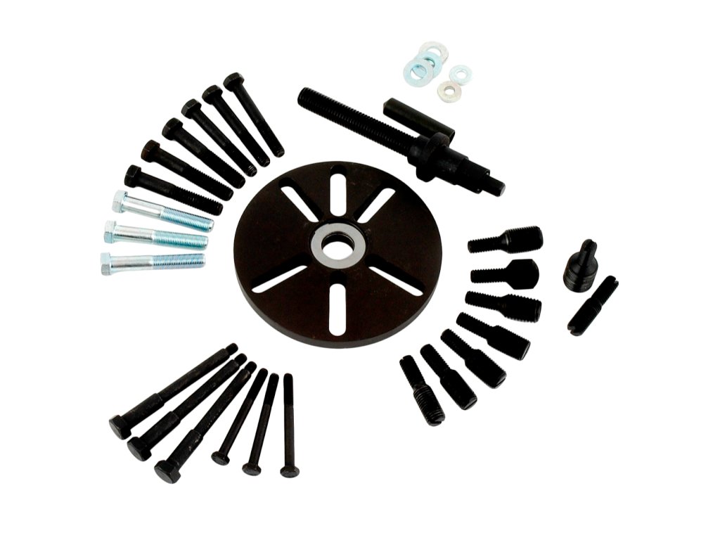 Univerzalni komplet za odstranjevanje vztrajnikov običajnih motorjev. Ohišje vključuje ploščo s spremenljivimi utori za različne vpenjalne luknje in sklope pritrdilnih vijakov.