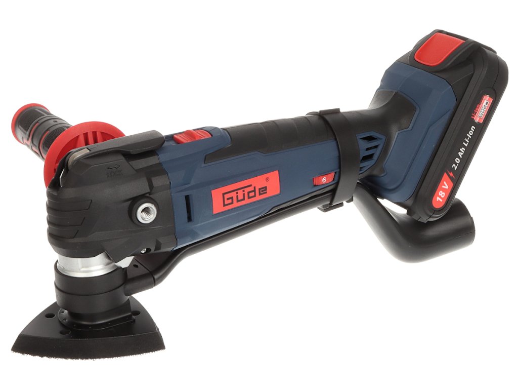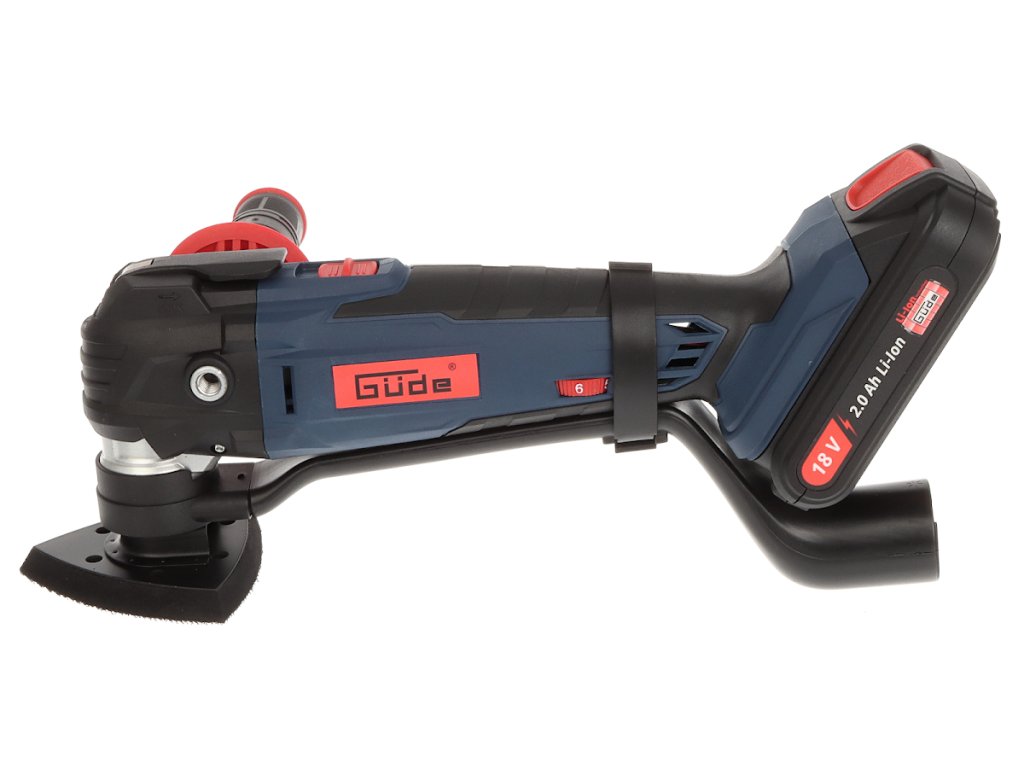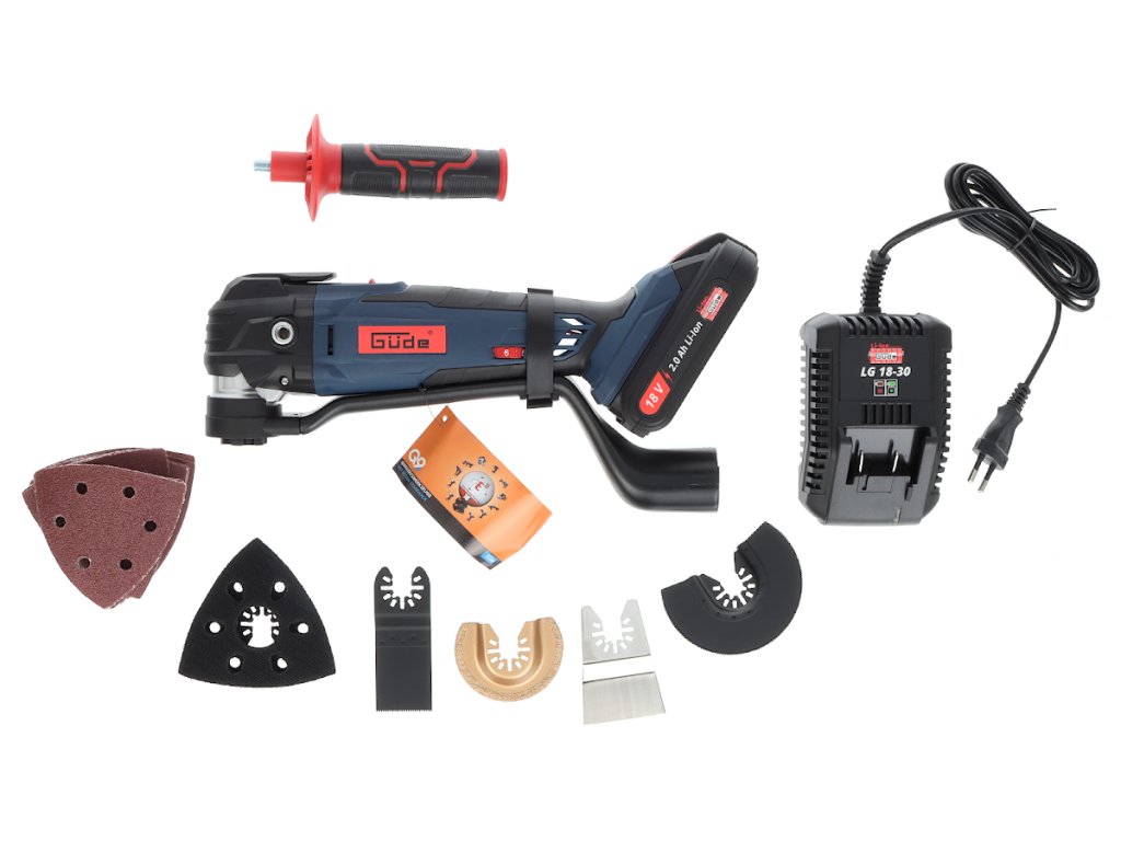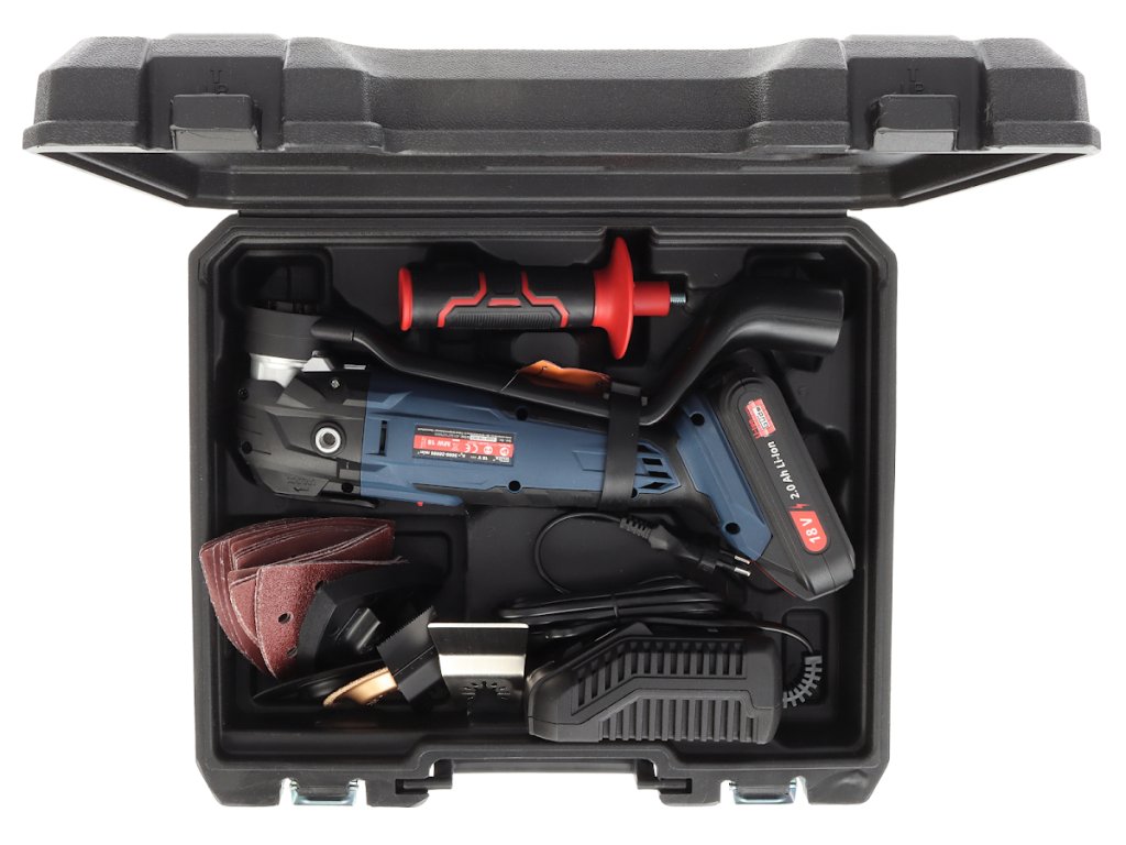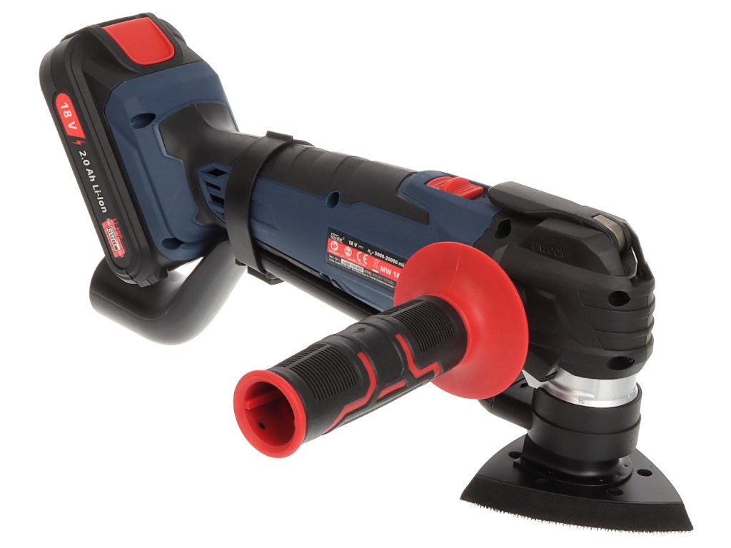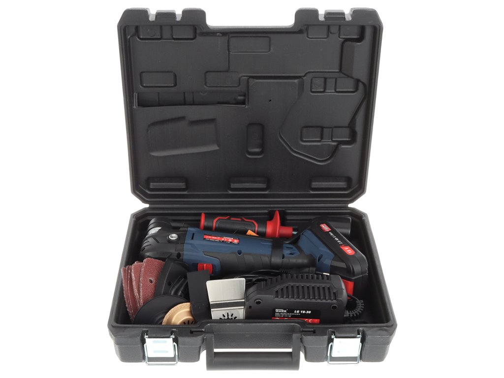 Oprema: Li-Ionska baterija 18 V / 2.0 Ah; polnilnik 3,0 A/h; 3 žagini listi (potop, segment, diamant); delta brusilna plošča 93 mm; komplet brusnega papirja K60 - K320, 18 kosov; Strgalo; Plastično transportno ohišje.