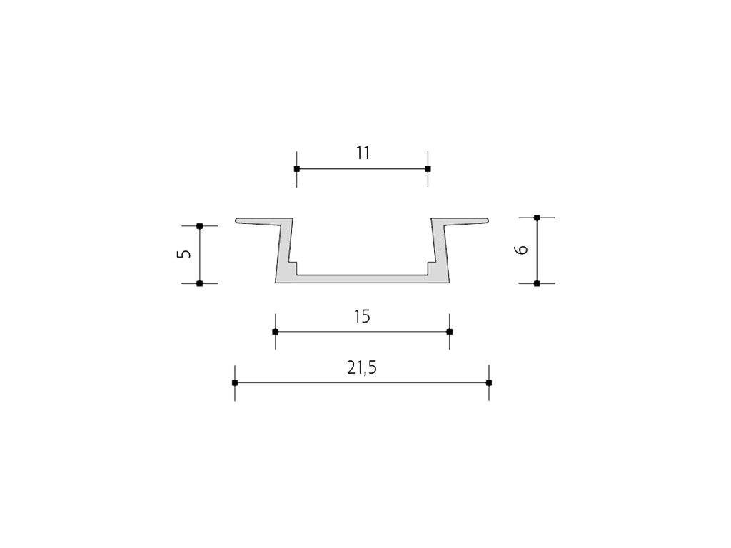 Al profil za montažo v utor 15,5 × 5,5 mm, za LED trakove širine do 10 mm, s plastičnim difuzorjem opala. Dobavljamo s sponkami in pritrdilnimi elementi, potrebnimi za montažo in s končnimi kapicami.