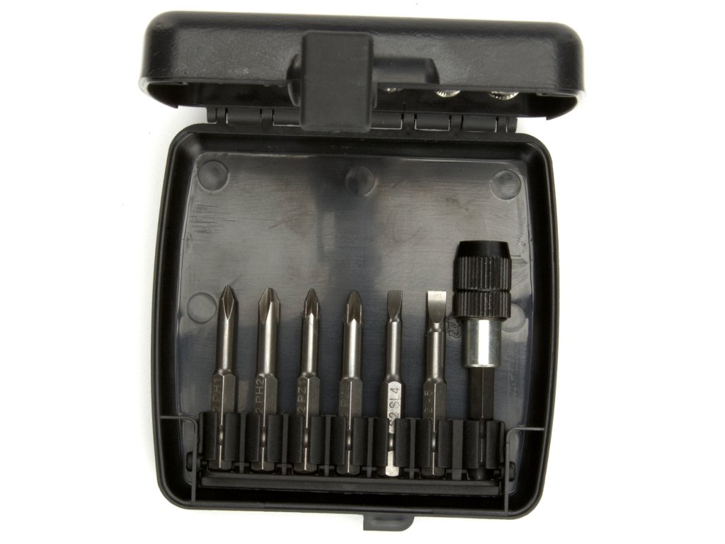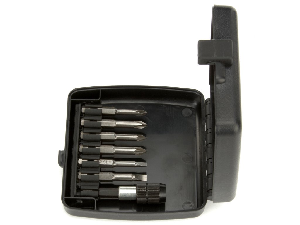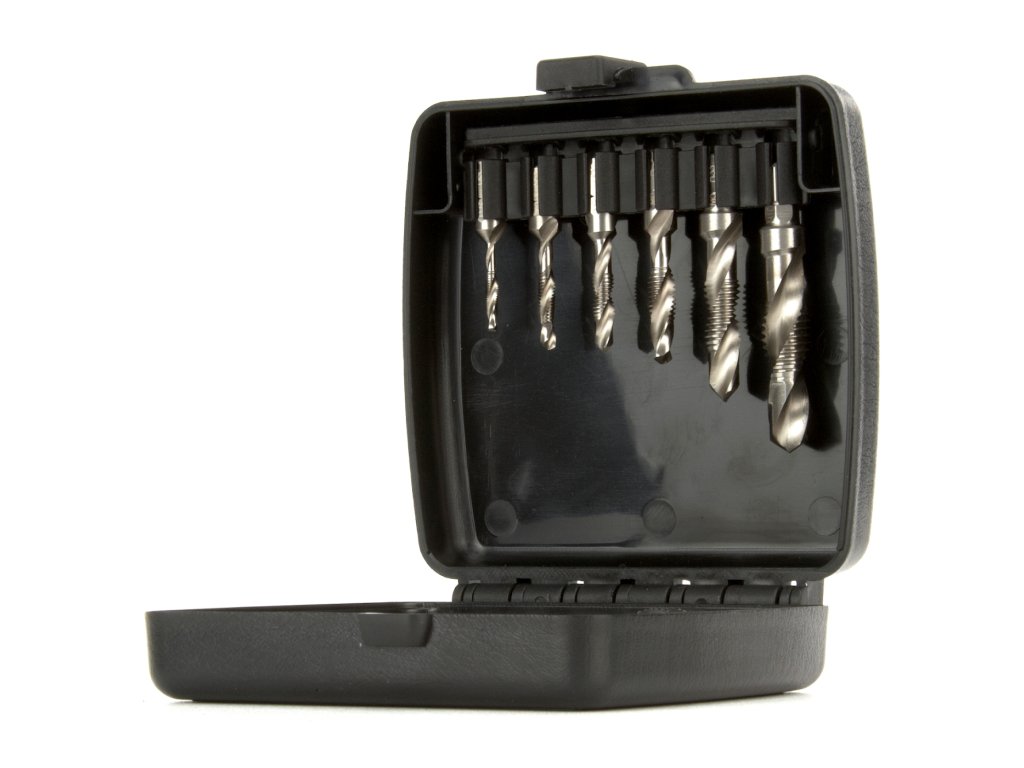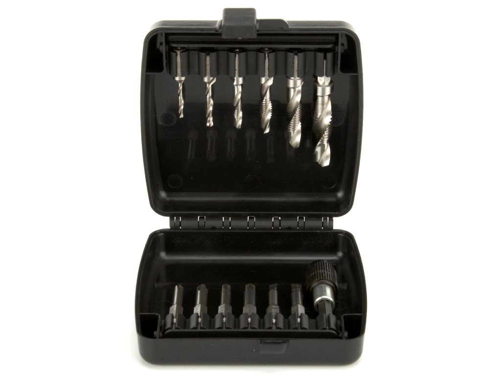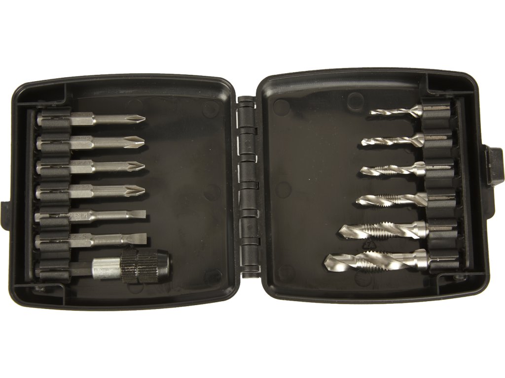 Niz bitov in vrtalnikov s koničnim pomivalnim koritom je izdelan iz jekla HSS za dolgo življenjsko dobo. Ustvari nit in deburrje v eni operaciji, kar prihrani čas in vrtanje. Lahko se uporablja na jeklu, bakru, medenini, aluminiju in plastiki. Komplet vsebuje 6 kosov vrtalnikov in pip M3 × 0.5, M4 × 0.7, M5 × 0.8, M6 × 1, M8 × 1.25, M10 × 1.5, 1 podaljšek, 6 kosov CRV bitov SLOT4, SLOT5, PH1, PH2, PZ1, PZ2. Pakirano v plastični škatli.