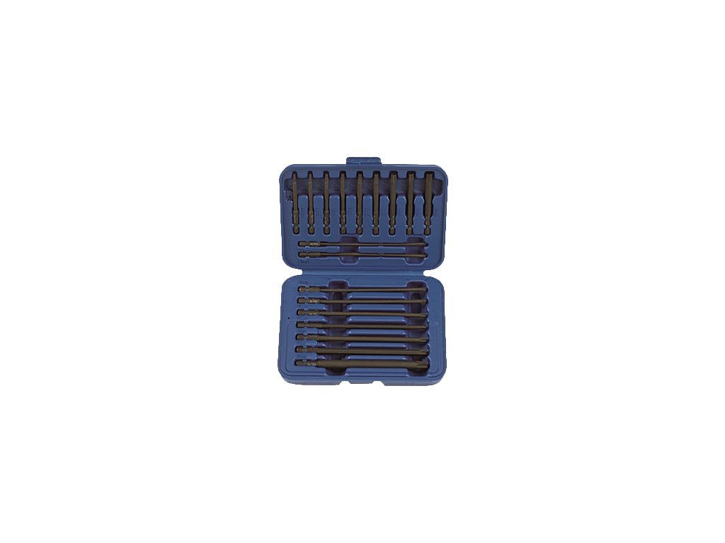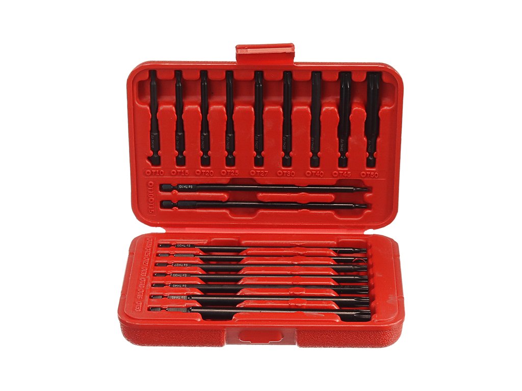 Komplet vsebuje 9 kosov 1/4" x 75mm - Torx: T10; 15; 20; 25; 27; 30; 40; 45 in 50. 9 kosov 1/4" x 150mm - Torx: T10; 15; 20; 25; 27; 30; 40; 45 in 50. Material: jeklo, zaključek: fosfatiranje. Pakirano v plastični škatli.