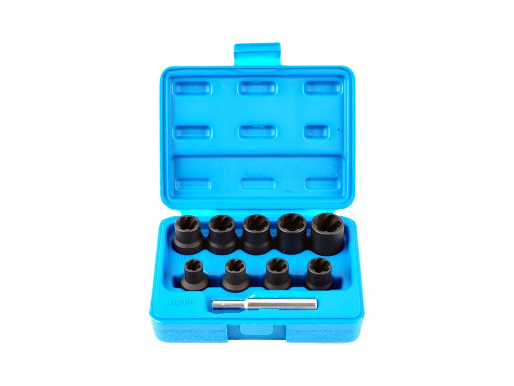 Vtičnica 1/2" gola ključi z edinstveno obliko 6-levih spiralnih utorov so zasnovani tako, da zrahljajo poškodovane glave vijakov in matic. Oblika utorov zagotavlja trdno samozaporno vpenjanje. Izdelek je kovan, toplotno obdelan. Komplet vključuje ključe vtičnic 10, 11, 12, 13, 14, 15, 16, 17, 19 mm.