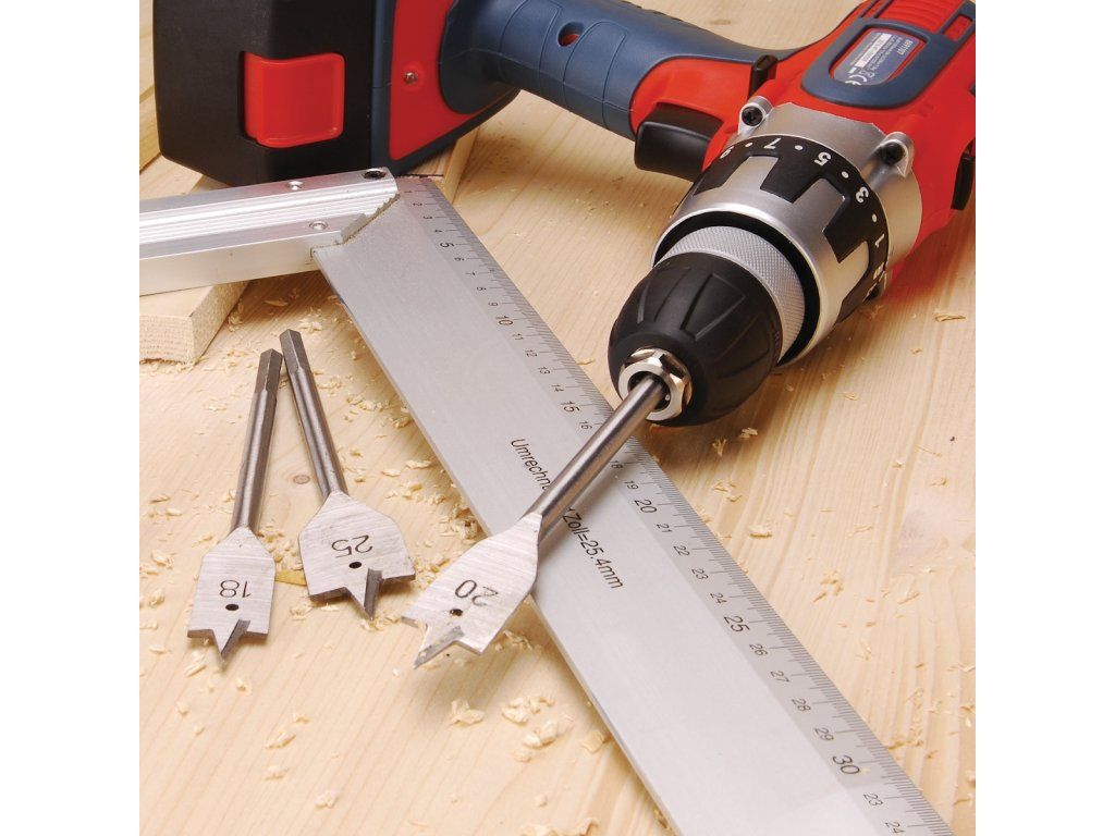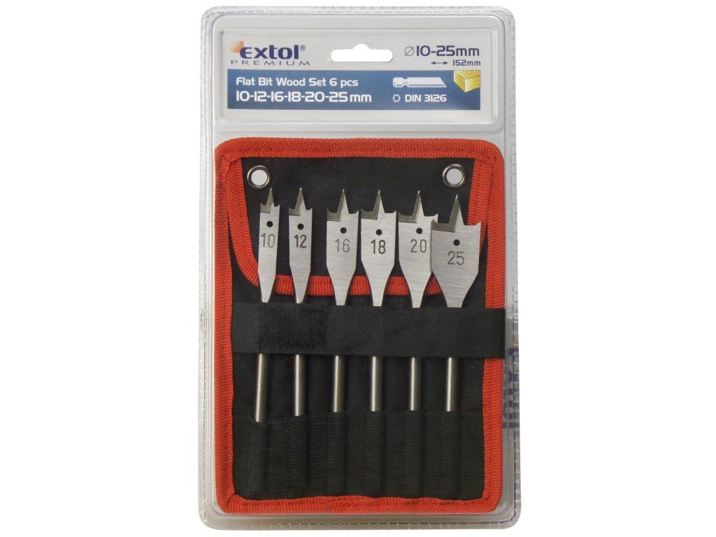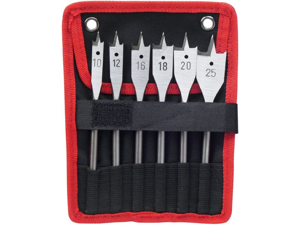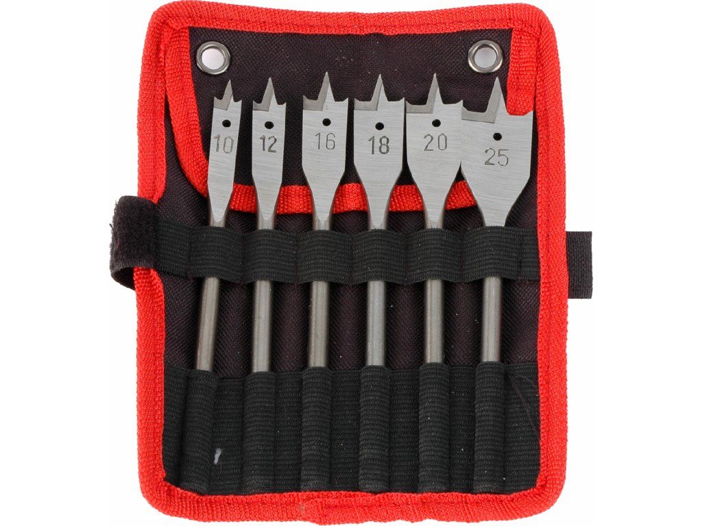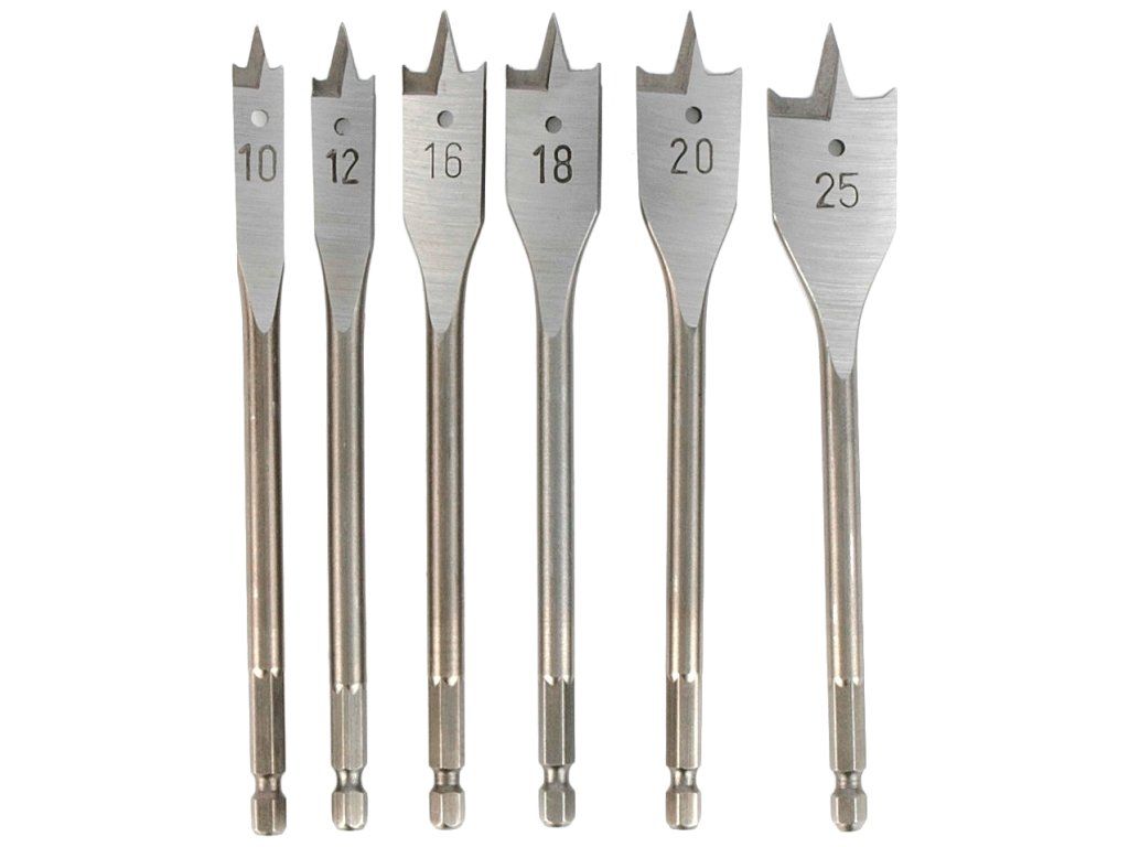 Ploščati svedri iz visoko ogljikovega jekla za vrtanje v les 10, 12, 16, 18, 20 in 25 mm. 6HR steblo po DIN3126, natančno podlago.
