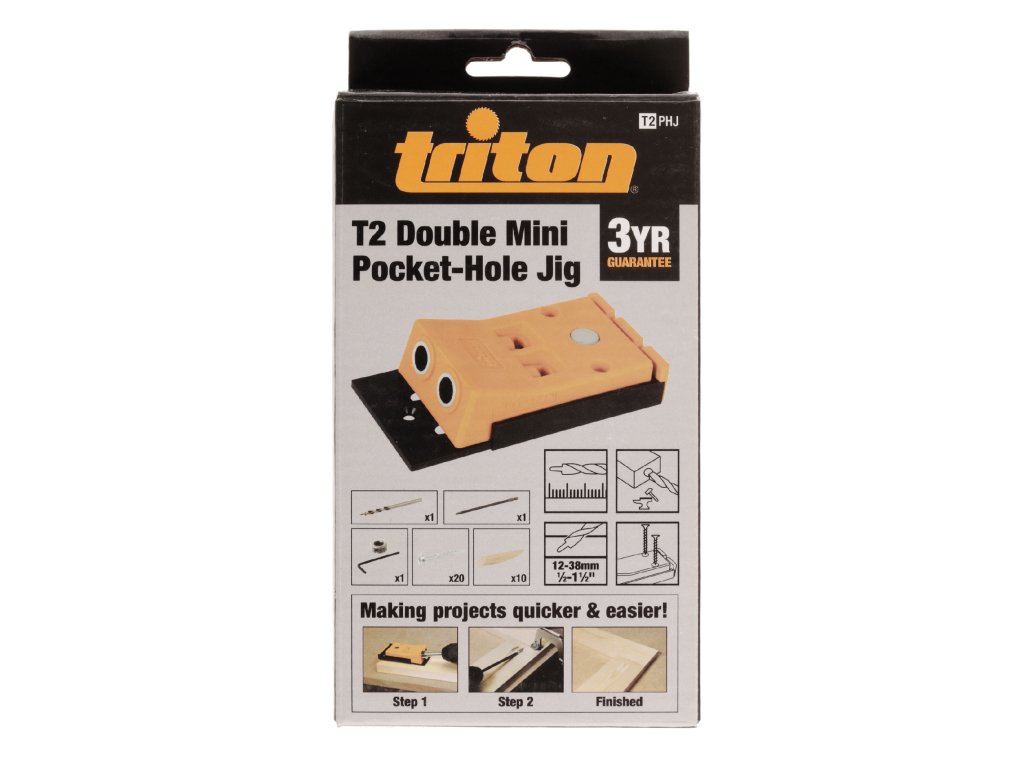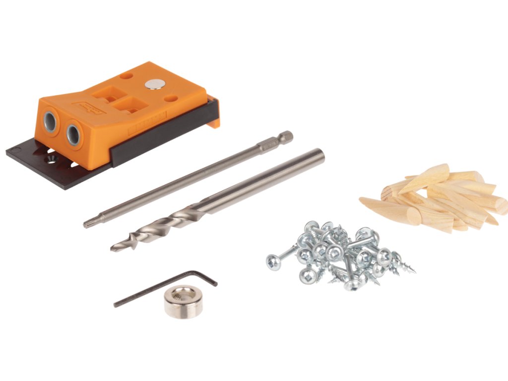 Vrtalna šablona z dvema utrjenima rokavoma za žep. Izdelana iz trpežne plastike. Komplet vključuje vrtalno šablono, 152 mm 3/8" stopničasto svedro, 1/4" SQ3 bit 152 mm, 3/8" stopnjo, 6 HR ključ, povezovalne vijake in lesene čepe.