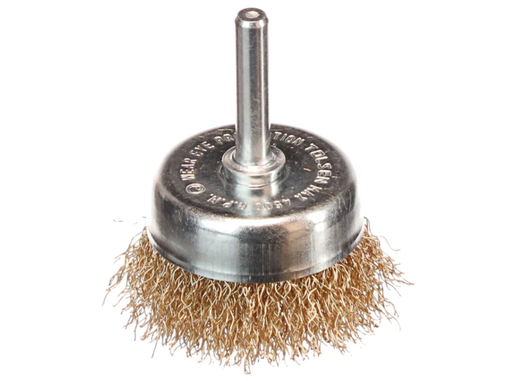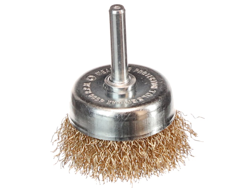 Idealno za odstranjevanje rje in barve s kovinskih površin. Premer krtače 50 mm (telo Ø 39 mm), žica Ø 0,3 mm, dolžina žice 16 mm, dolžina stebla 30 mm, skupna dolžina krtače 62 mm, krak Ø 6,35 mm, največja hitrost 4,500 vrt / min.