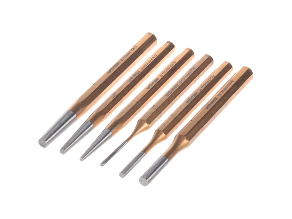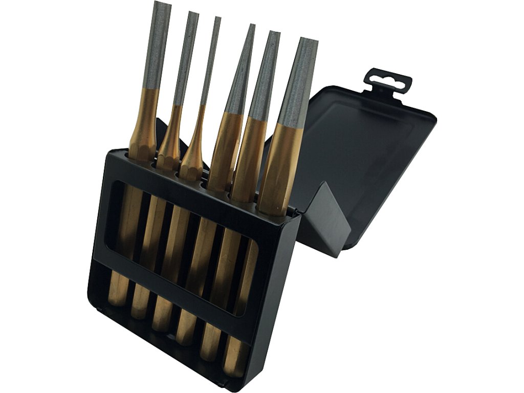 Komplet 3 udarcev in 3 udarcev za zatiče. Udarci z dimenzijami Ø 3; 5 in 8 × 150 mm, Ø 3 ejektorji; 5 in 8 × 150 mm. Orodja so izdelana iz CrV jekla, kar zagotavlja njihovo dolgo življenjsko dobo. Shranjeno v plastični škatli.