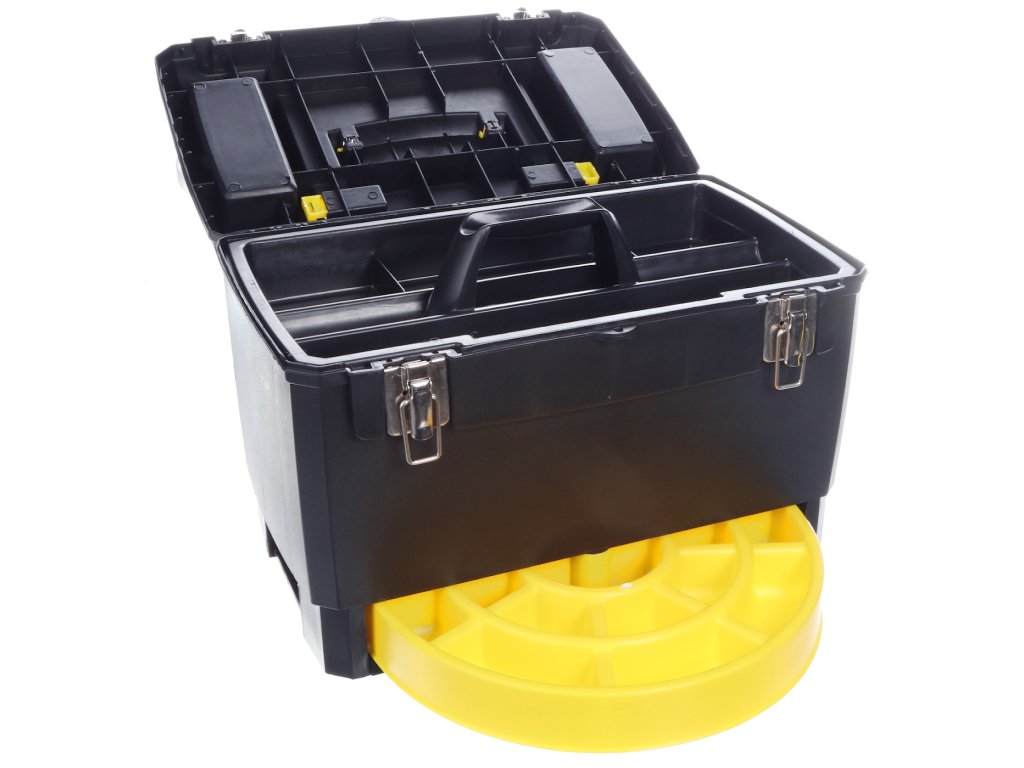 Škatla je sestavljena iz dveh ločenih, odstranljivih delov. Zgornji del je plastično ohišje za orodje, ki ga je mogoče zakleniti, z zložljivim ročajem. Spodaj je krožna, vrtljiva škatla, ki omogoča popolno dostopnost shranjenih pritrdilnih elementov. Na dnu je platnena vrečka za orodje. Za lažji prevoz je škatla opremljena s kolesi Ø 148 mm in izvlečnim ročajem. Skupna nosilnost je 20 kg. Splošne dimenzije 470 × 270 × 630 mm.