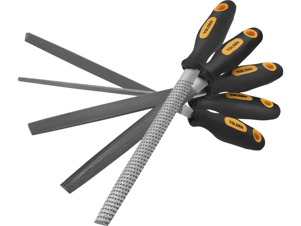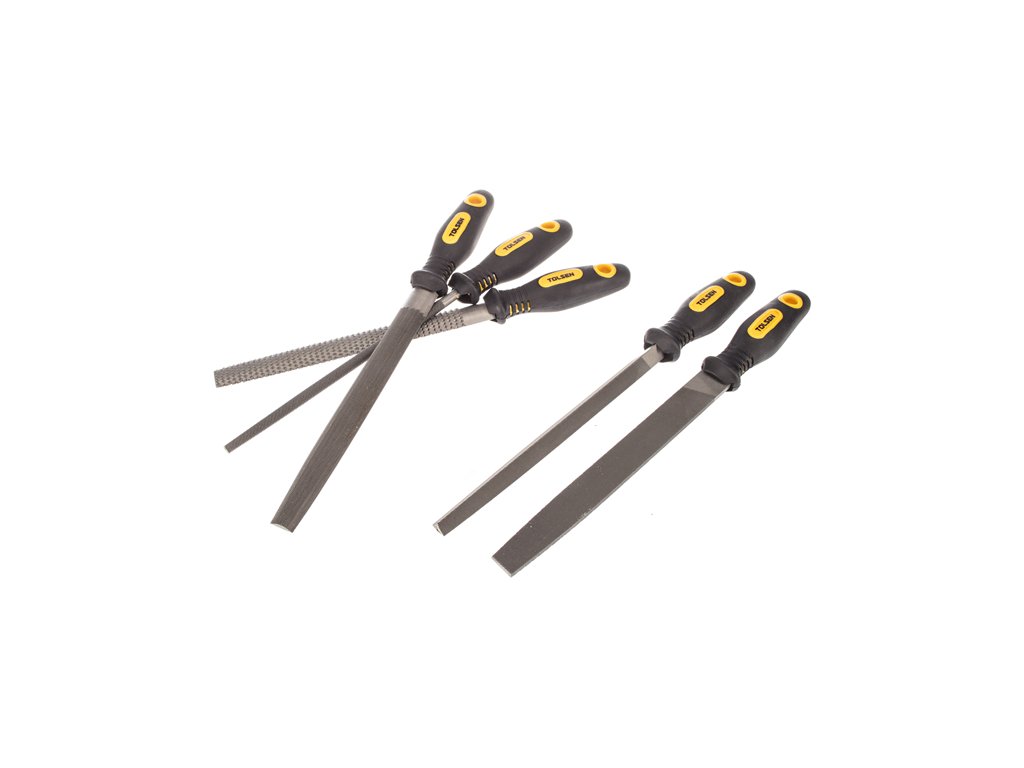Komplet vključuje: ravno, polkrožno, okroglo in trikotno datoteko ter polkrožno lesno rasp. Dolžina 200mm, izdelana iz ogljikovega jekla T12. Dvobarvni plastični ročaj.