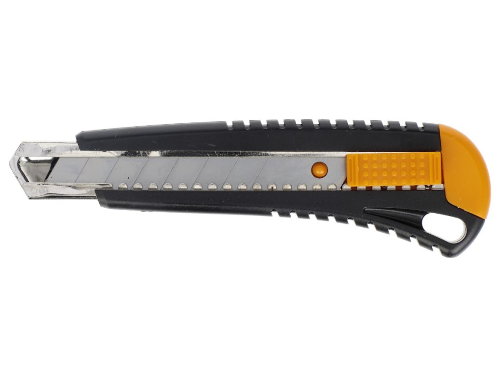 Profesionalni nož za snap-off s praktičnim rezalnikom rezil. Ima ergonomsko oblikovan plastični ročaj za udoben in trden oprijem. Zgornji oranžni del ročaja je odstranljiv in se uporablja za varno odlomijo topega dela rezalnega roba. Ima praktično očesce za obešanje. Rezilo se samodejno zaklene. Nožev ni mogoče kupiti za nadomestna rezila. Širina rezila: 18 mm. Garancija: 5 let.