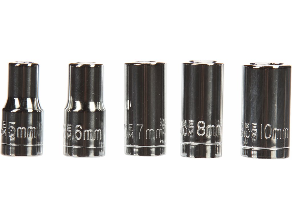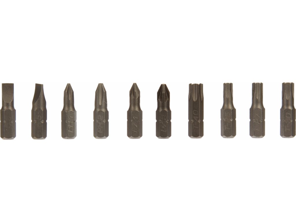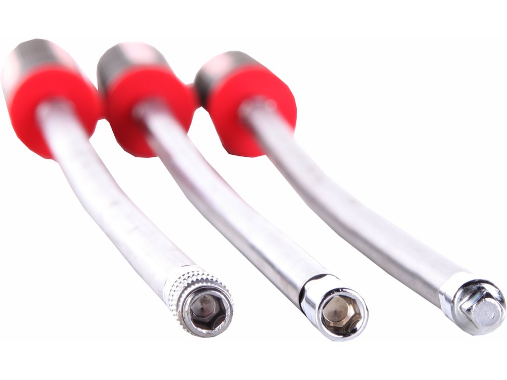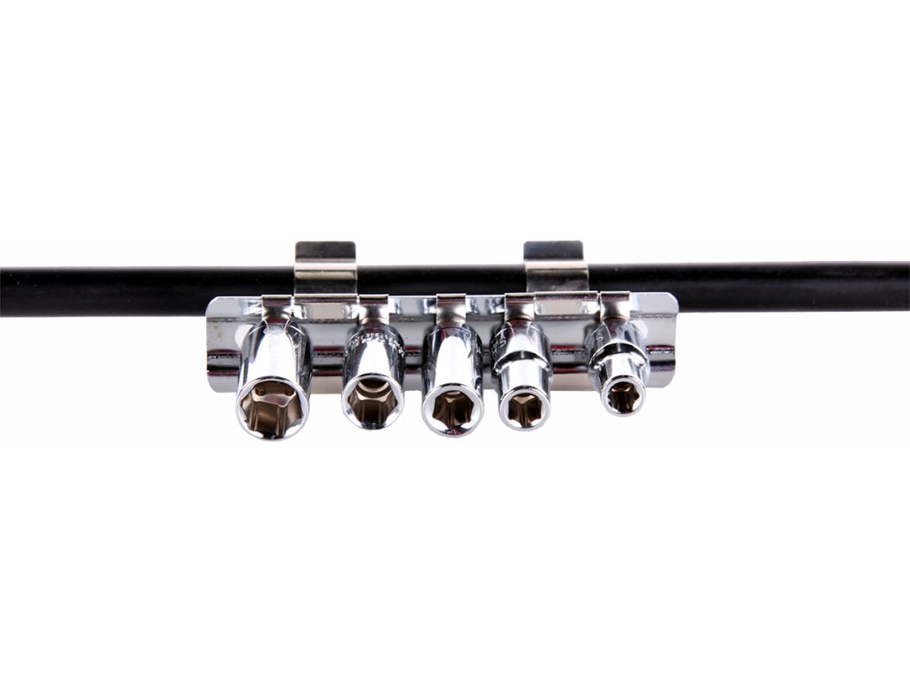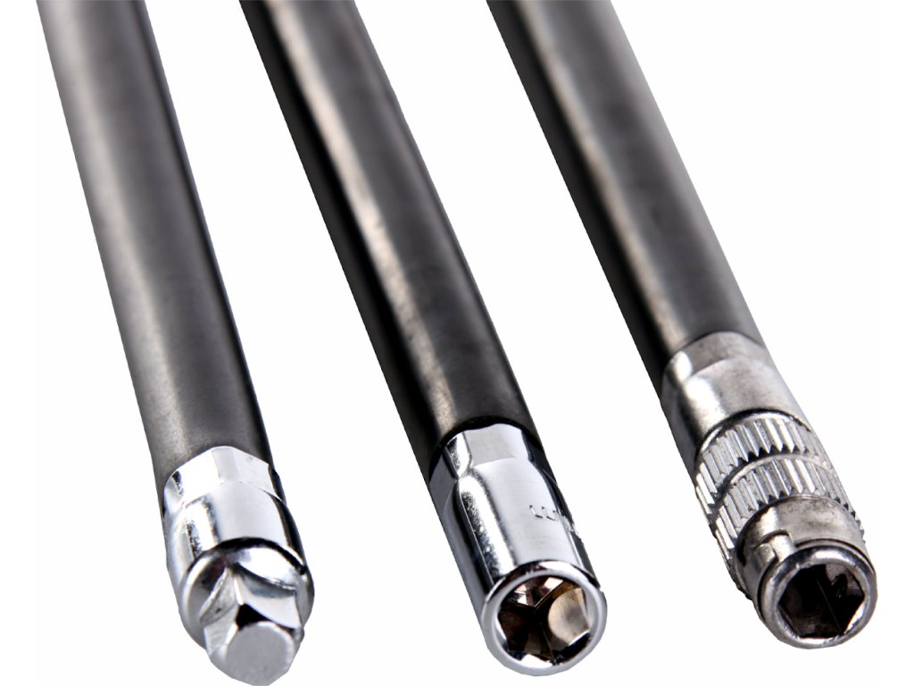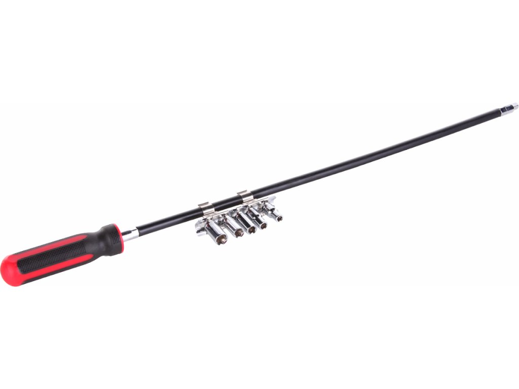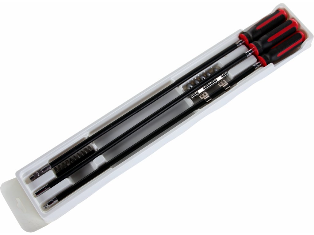 Omogoča lažje zategovanje in zrahljanje nerodno nameščenih cevnih sponk. Komplet vključuje: 1 izvijač z 1/4" kvadratno vtičnico in dolžino 610 mm, 1 izvijač z 1/4" šesterokotno vtičnico dolžino 610 mm za bite, 1 izvijač z vtičnico 1/4" šesterokotnik dolžine 7 mm dolžine 610 mm, 10 kosov 1/4" x 25 mm bitov (S4 - S5 - PH1 - PH2 - PZ1 - PZ2 - T20; T25 - T30 - T40), 5 matic velikosti 5 - 6 - 7 - 8 - 10 mm. Material: rezilo iz jeklene žice in ročaj PP + TPR.