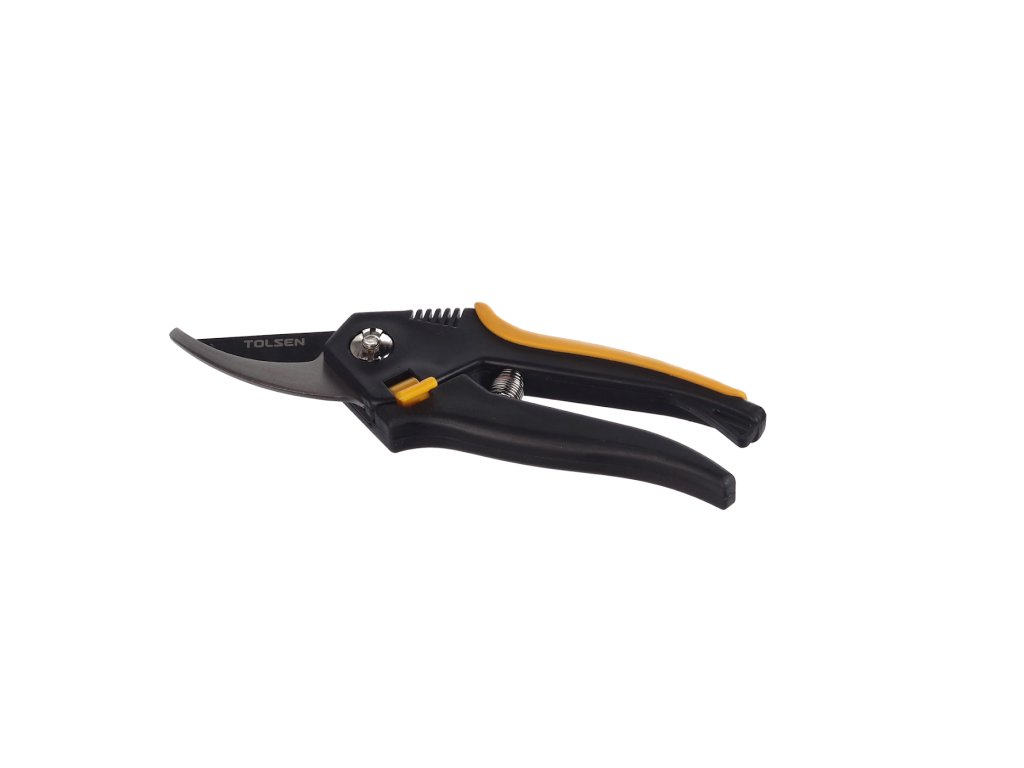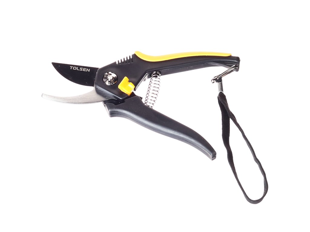 Visokokakovostni škarji za obrezovanje rastlin, grmičevja in dreves. Plastični ročaji. Rezila, prevlečena s teflonom. Zapestni trak.