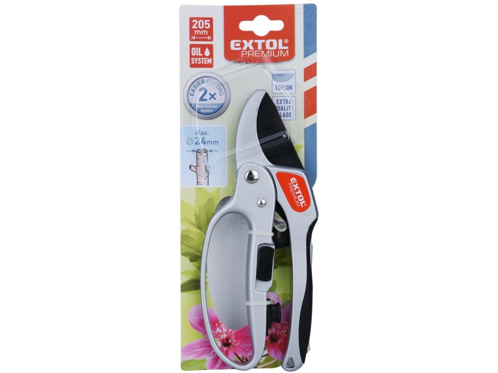 Škarje so opremljene z zaskočnim orodjem za koračno rezanje z manjšo silo med delom, kar omogoča rezanje vej s premerom do 24 mm. Poleg tega so opremljeni s trosilnikom olja v ročaju za obdelavo rezalnega roba po delu (olje zmanjšuje trenje in ščiti pred korozijo). Zaklepna ročica je za ta model samoumevna. Rezila so izdelana iz visokokakovostnega jekla SK5. Skupna dolžina škarij je 205 mm.