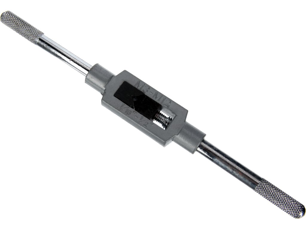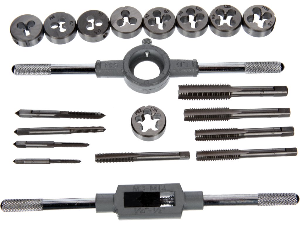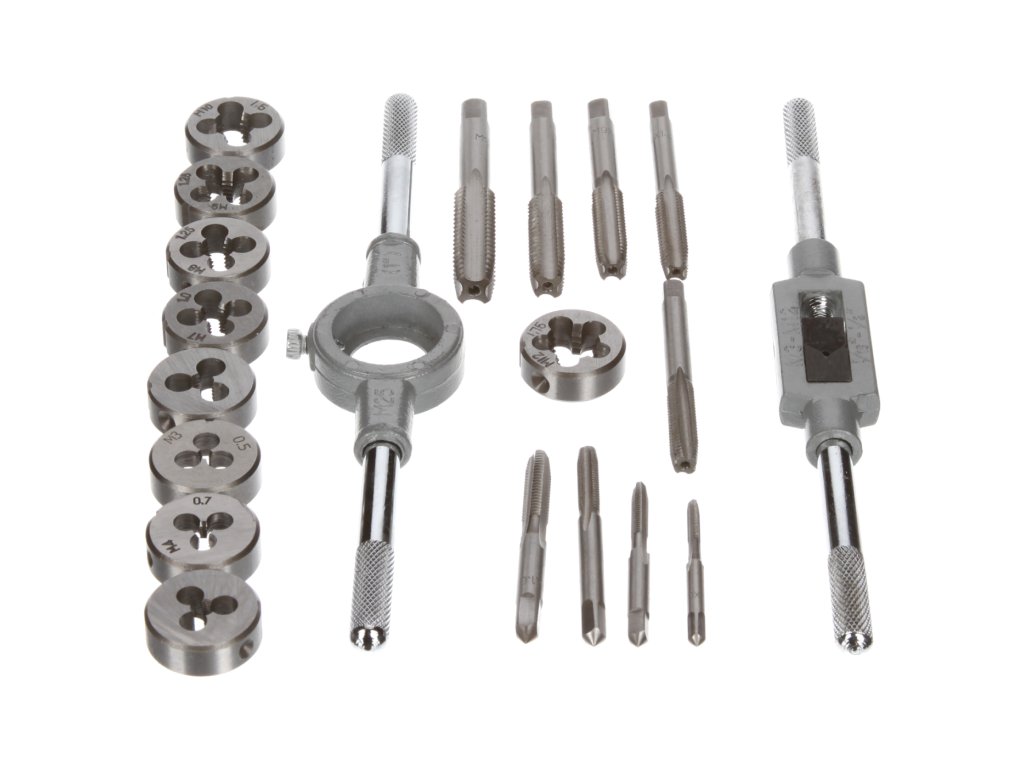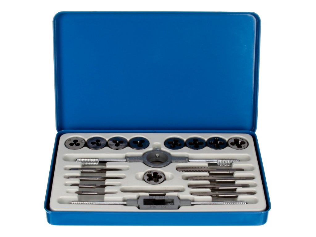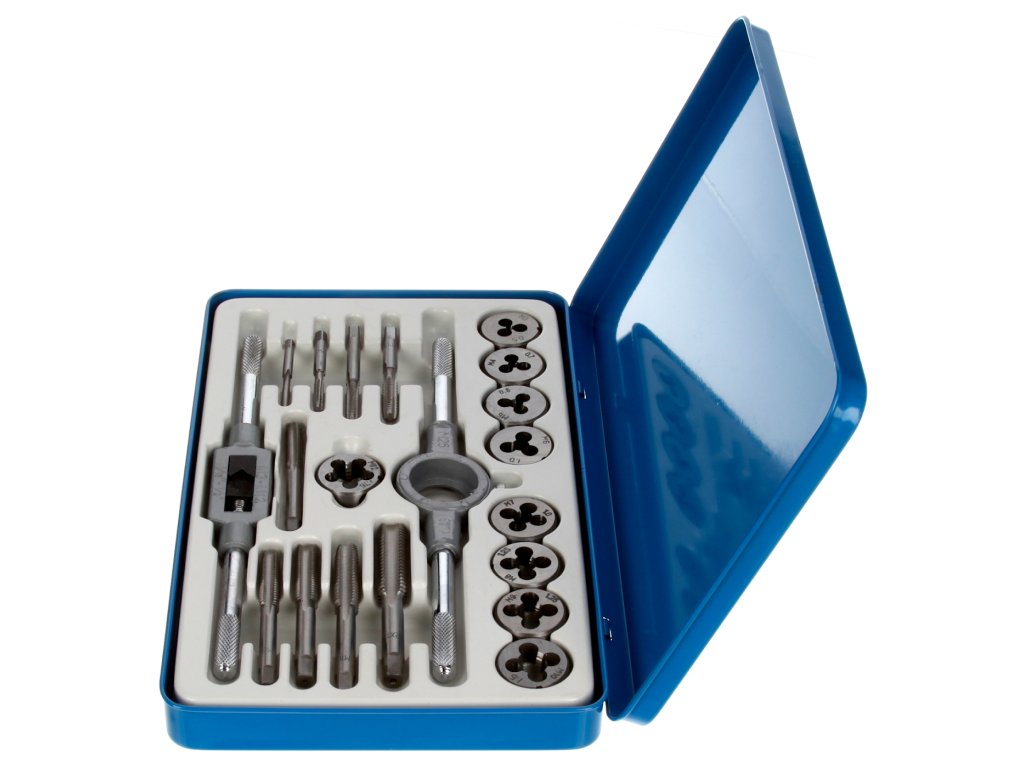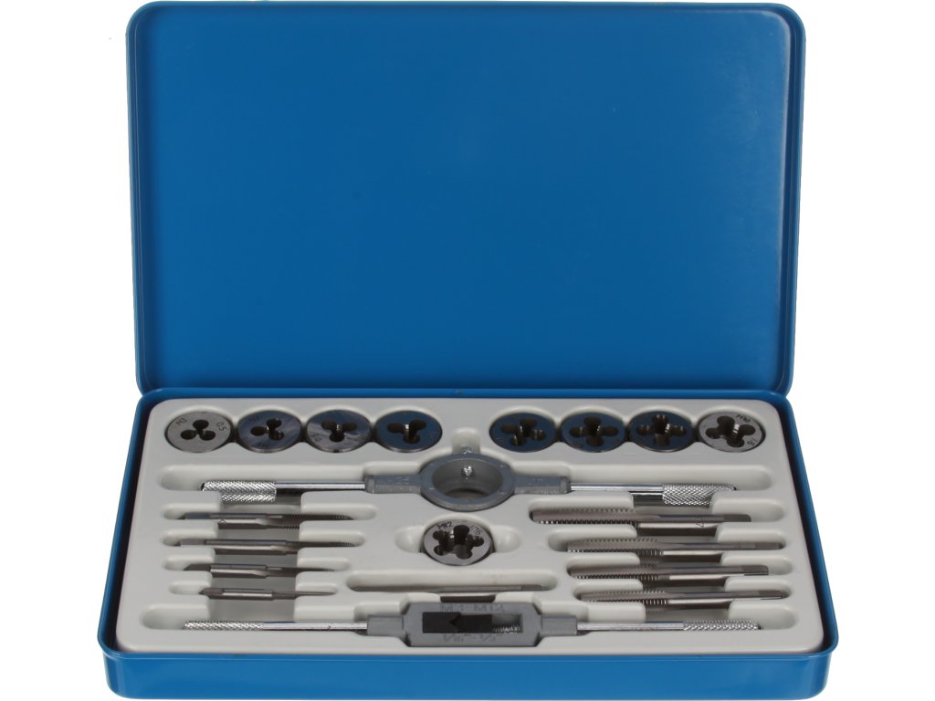 Komplet 9 pip, 9 navojnih očesc in ustreznih ključev, jasno shranjenih v ohišju iz pločevine. Mere: M3 x 0,5, M4 x 0,7, M5 x 0,8, M6 x 1,0, M7 x 1,0, M8 x 1,25, M9 x 1,25, M10 x 1,5, M12 x 1,75 so enake za obe vrsti orodij.
