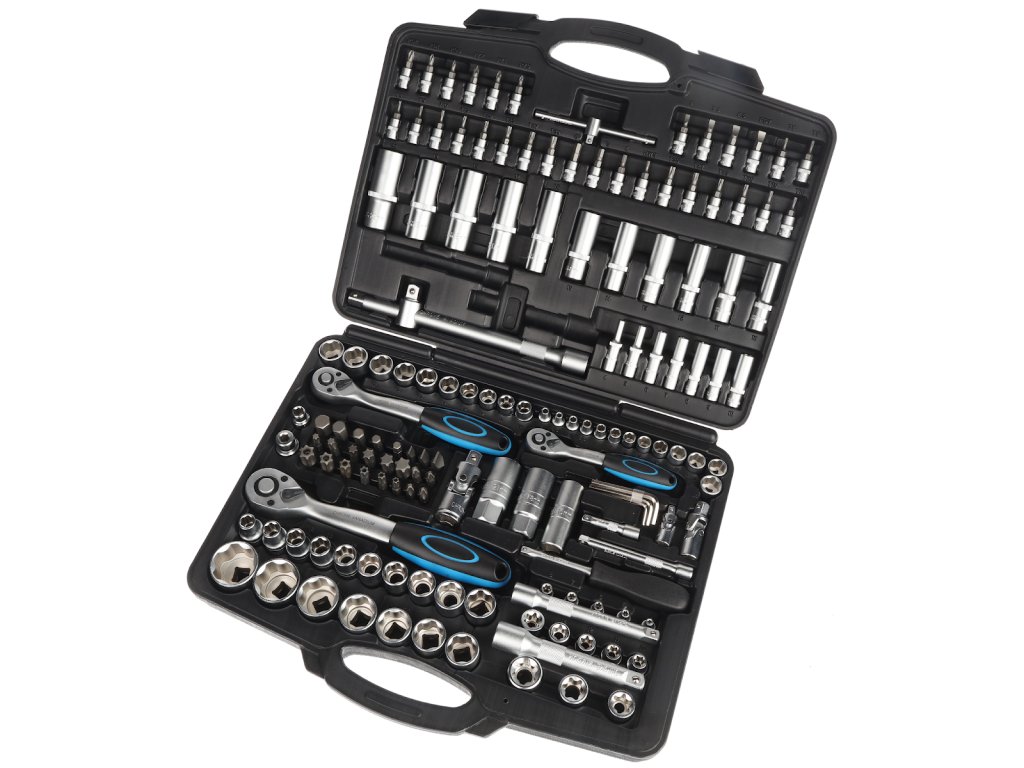 Popolnoma opremljen komplet ključev za vtičnice vsebuje skupno 150 kosov: Material Cr-V jeklo, mat kromirana površina. 1/4" set: 13 kom 4 tipke; 4,5; 5; 5,5; 6; 7; 8; 9; 10; 11; 12; 13; 14 mm, 7 kosov dolgi ključi vtičnic 4; 5; 6; 7; 8; 9; 10 mm, HEX 3 bitov; 4; 5; 6 mm, PZ0; PZ1; PZ2; PH0; PH1; PH2; T8; T9; T10; T15; T20; T25; T27; T30; izvrtani T8; T9; T10; T15; T20; T25; T27; T30; E4; E5; E6; E7; E8; stanovanje 4; 5,5; 6,5; 7 mm, zgibna vtičnica, 2 podaljška 50 in 100 mm, upognjen zaskočnik s 5° stopnicami (72 z), drsni "T" kos. 3/8" set: 10 kom 10 ključev; 11; 12; 13; 14; 15; 16; 17; 18; 19; 6 dolgih vtičnic 10; 11; 12; 13; 14; 15 mm, 18 ključev za sveče, ključi E10; E11; E12; E14; E16; E18, podaljšek 125 mm, bitni adapter, zgibni nastavek, upognjen zaskočnik v 5° stopnicah (72 t). 1/2" set: 17 kom 10 tipk; 11; 12; 13; 14; 15; 16; 17; 18; 19; 20; 21; 22; 24; 27; 30; 32 mm, 2 kosa dolgi ključi vtičnic 16; 18 mm, 3 kosi s plastično prevleko 17; 19; 21 mm, E20; E24, ključi vžigalnih svečk 16 &; 21, zgibna vtičnica, podaljšek bit 125 & 250 mm, bitna vtičnica 1/2" (m) 3/4" (f), bitni adapter, 5 bitov vtičnic: HEX 8; 10; 12; 14 mm, PZ3; PZ4; PH3; PH4; T40; 45; 50; 55; 60; 70, stanovanje 8; 10; 12 mm, izvrtan T40; 45; 50; 55; 60; 70, upognjen zaskočnik s 5° stopnicami (72 Z). Druga oprema: komplet tipk "L" Allen z 1,5 krogličnim koncem; 2; 2,5; 3; 4; 5 mm.