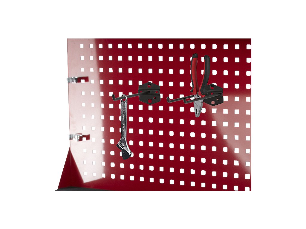 Komplet kavljev MAX za delovno mizo z nadgradnjo (zaporedna št. TSC5911J). Sestava: 3 × enojni kavelj 100 mm, 3 × 200 mm, 3 × dvojni kavelj 100 mm, 3 × 200 mm.