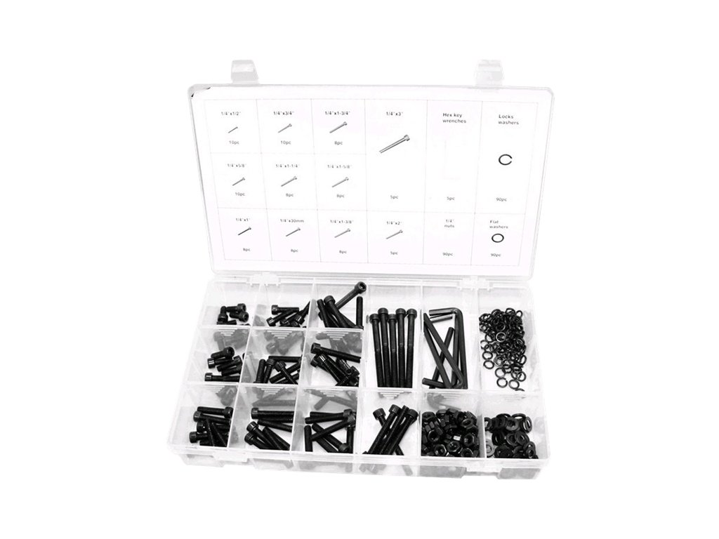 Komplet vsebuje 10 kosov M6 × 13 vijakov; 16; 19; mm. 8x M6 × 25; 30; 32; 35; 41; 45 mm. 5x M6 × 52; 75 mm. 5 Allenovih ključev; 90 kosov orehov M6; 90 kosov ravnih blazinic; 90 kosov vzmetnih podložk. Vse pakirano v plastični škatli.
