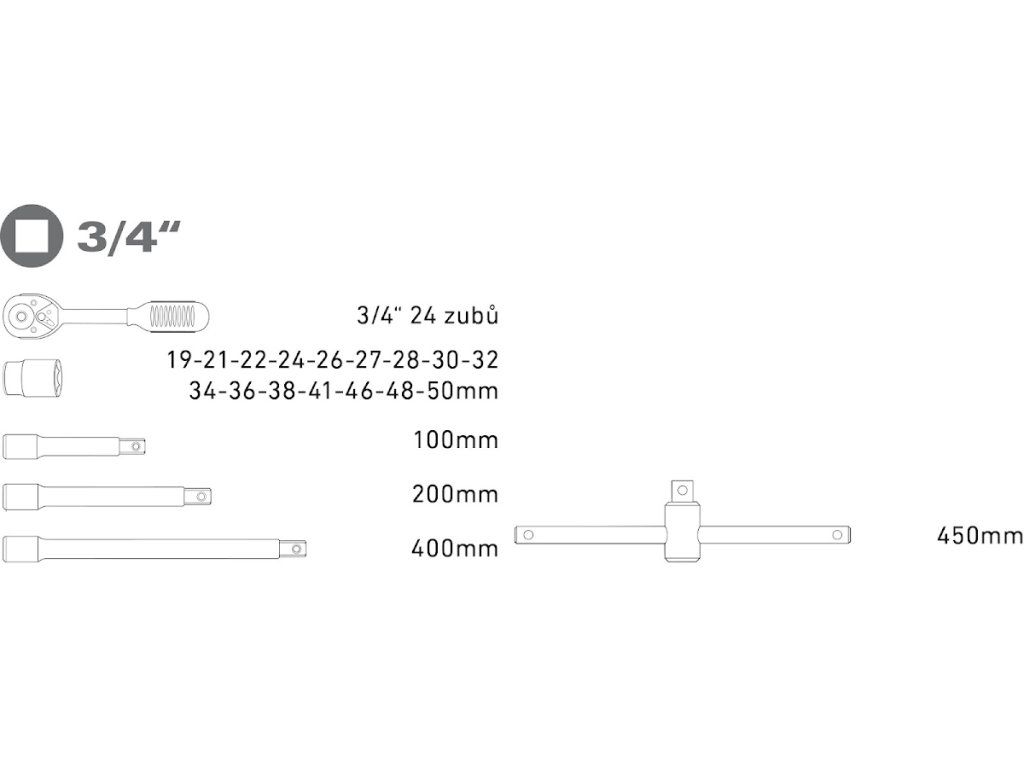 - vtičnica: 3/4": 19 - 21 - 22 - 24 - 26 - 27 - 28 - 30 - 32 - 34 - 36 - 38 - 41 - 46 - 48 - 50 mm