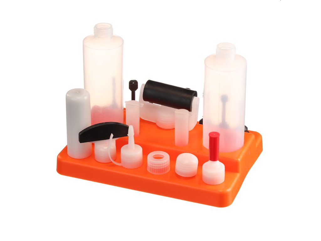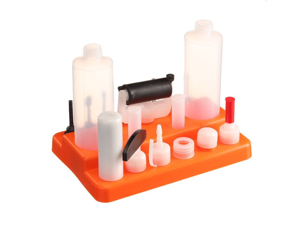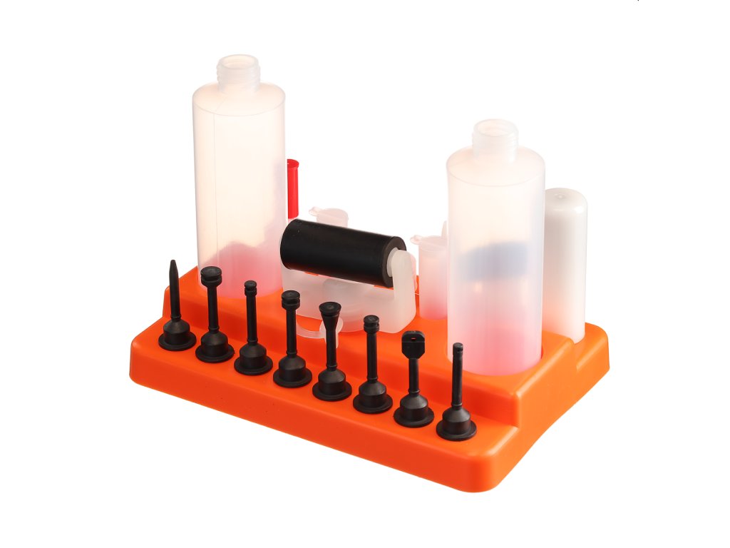 Vključuje 2 posodi za lepilo, valjček, lopatico ter različne priključke in aplikatorje za čisto lepljenje. Pakirano v plastični škatli, ki služi tudi kot stojalo.