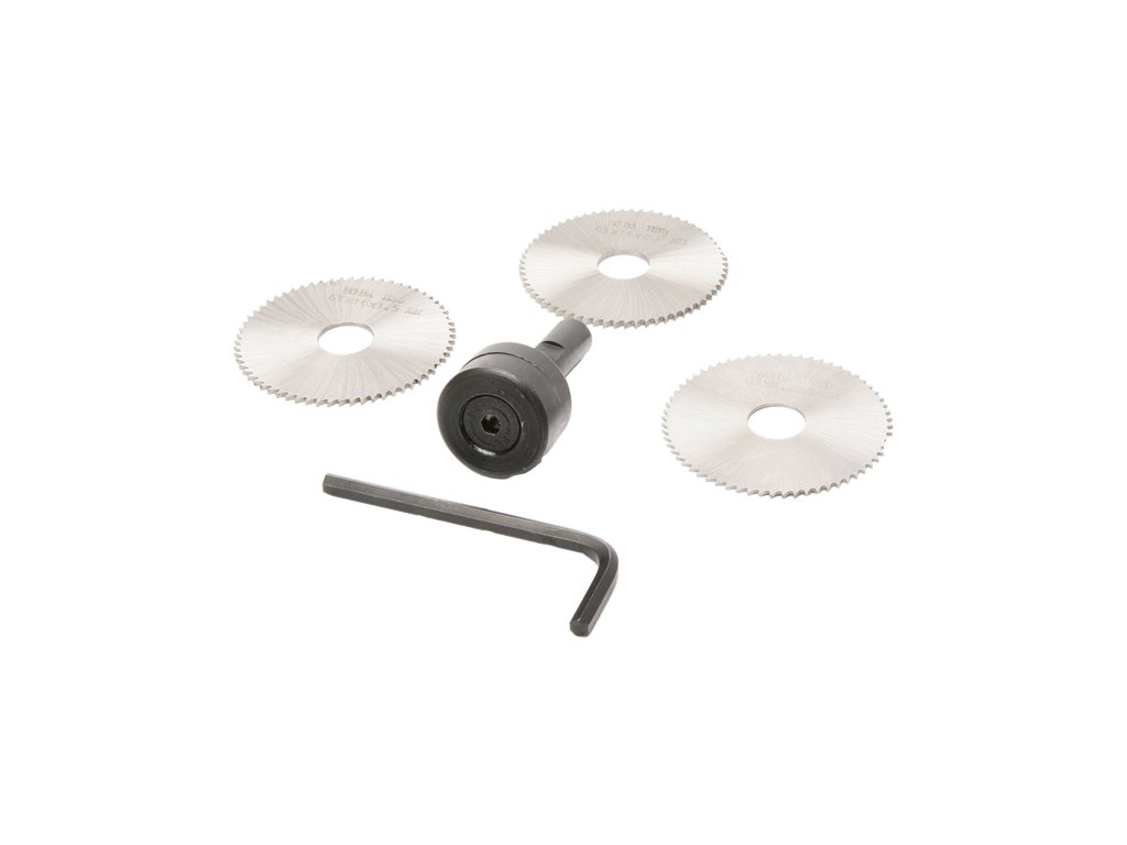 Praktičen komplet 3 žag za les, plastiko, lahke kovine in blago jeklo z vrtno uho – premer stebla 12 mm, dolžina 45 mm, primeren za uporabo z rezkalnim strojem ali stružnico. Diski ø 63 × 16 z debelino 1; 1,5; 2 mm sta izdelana iz hitrega jekla. Jekleni trn z zaklepnim vijakom je utrjen. Paket vključuje Allenovo tipko za zategovanje orodja.