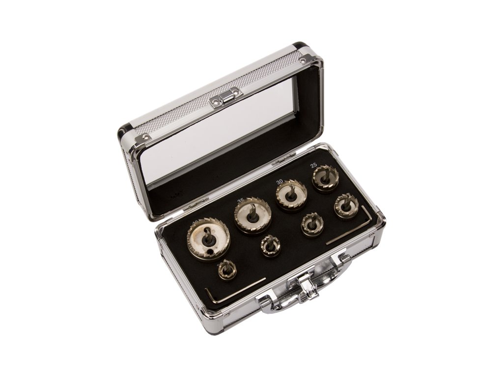 Komplet HSS kronskih svedrov s premerom 16, 18, 20, 22, 25, 30, 35, 40 mm. Primerno za vrtanje lesa, plastike in nekaterih mehkih kovin. Globina vrtanja 7 mm.