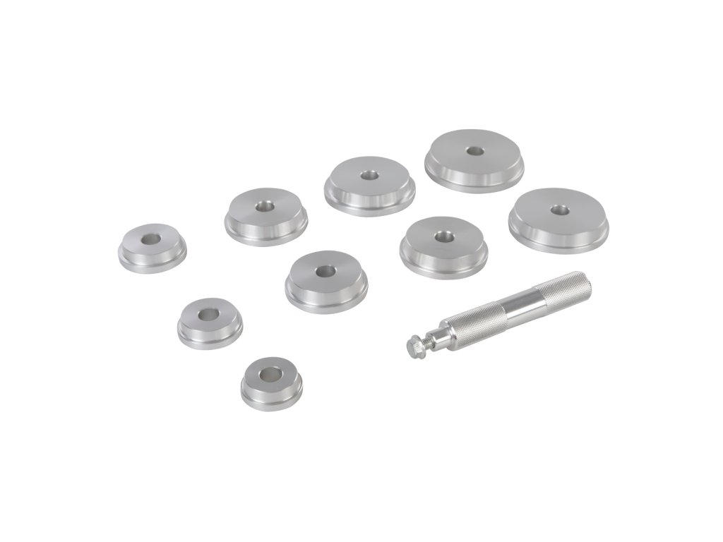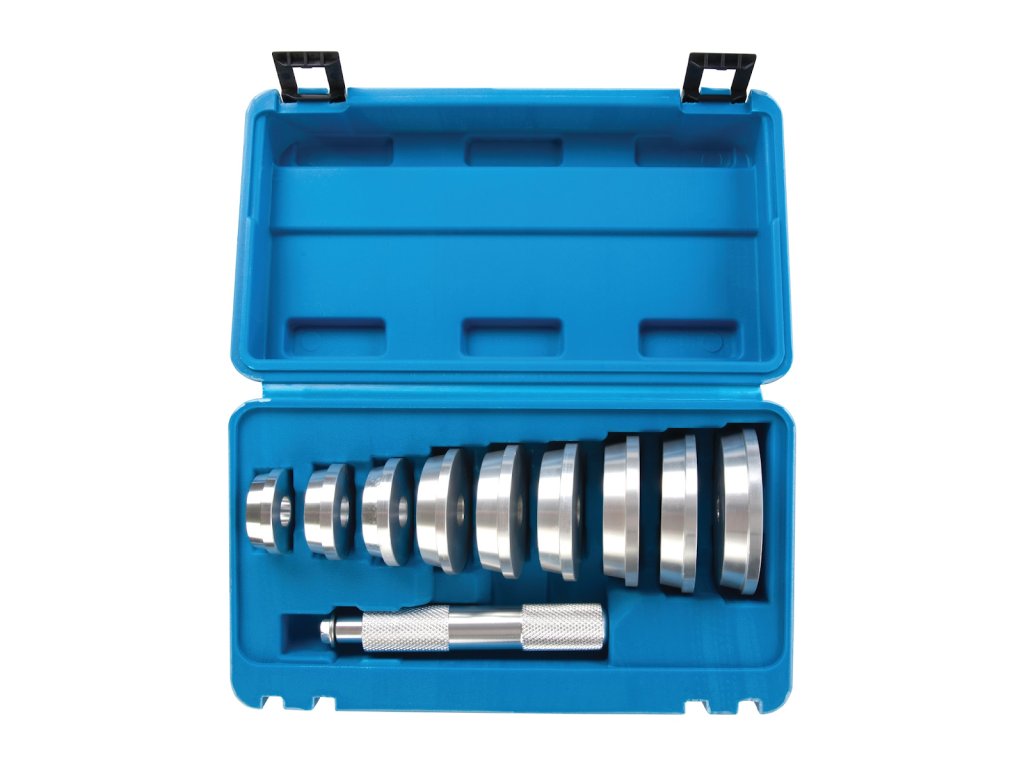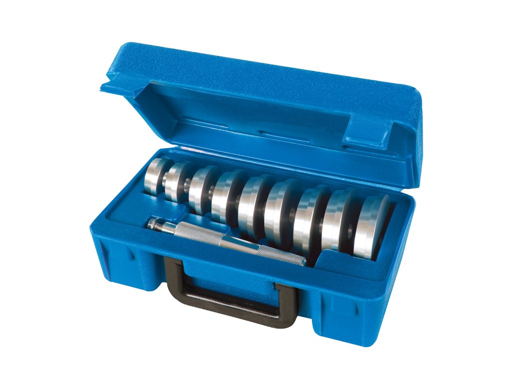 Aluminijasti obroči za vgradnjo ležajev in tesnil, ne da bi poškodovali ležaj in ohišje. Primerno za najpogostejše velikosti ležajev. Vključuje premere obročev: 40, 44, 50, 59, 63, 65, 72, 76 in 81 mm ter ročaj odbijača. Dobavljeno v trajnem ohišju.