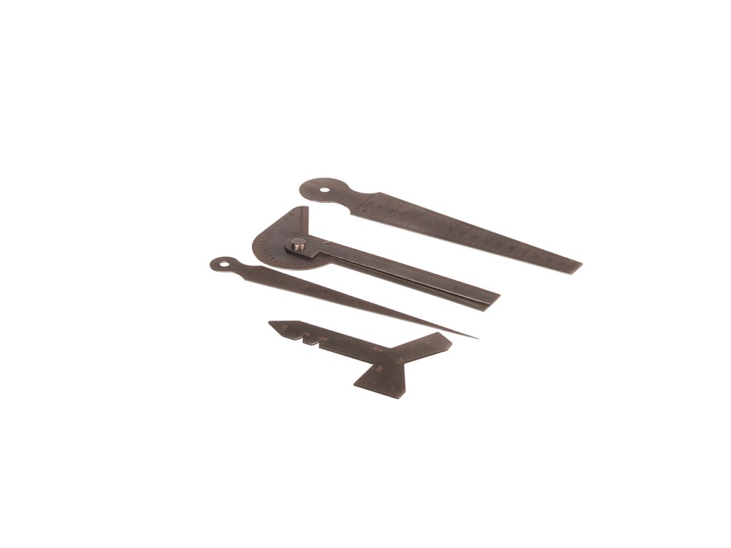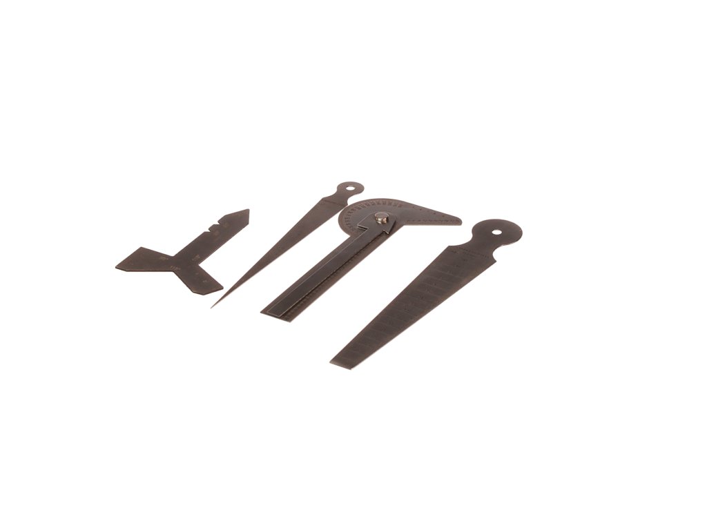 Komplet vključuje: 1. merilnik za hitro merjenje notranjega premera cevi – metrični, razpon 15 – 30 mm 2. merilnik za merjenje notranjega premera cevi – palcev, razpon 1/8" – 5/8" 3. fiksni profil za preverjanje kotov 55°, 60°, 90° in 118° z ravnilom (palčna in metrična skala) 4. večnamenski profil (preverjanje pravega kota, kotomer, določitev središča krožnega dela, nadzor zgornjega kota in dolžine rezalnega roba pri brušenju vrtalnikov, nastavljiva lestvica za risanje mnogokotnikov iz središča kroga). Merilniki so izdelani iz pločevine.