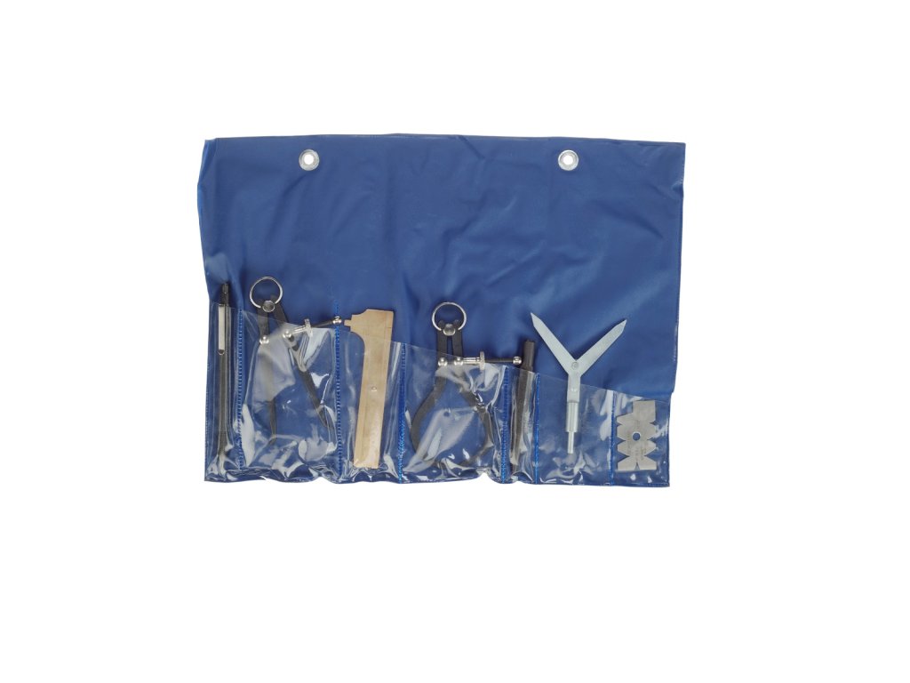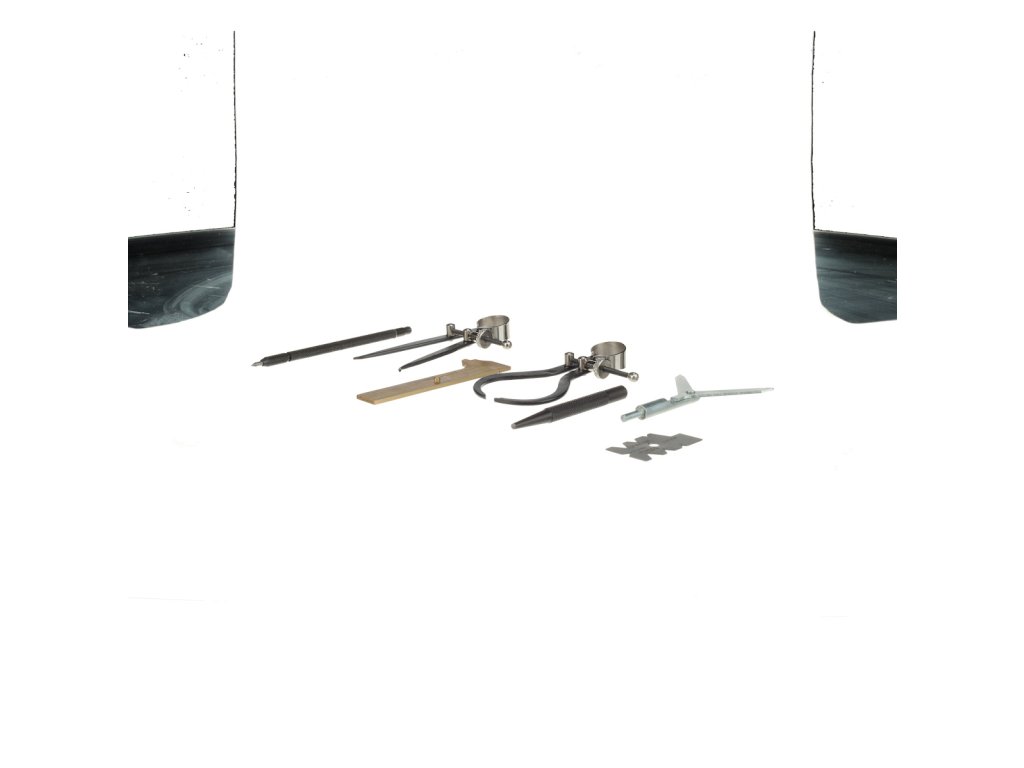 Komplet vključuje: zunanjo čeljust 100 mm, notranjo čeljust 100 mm, merilnik navoja, medeninasto čeljust 100 mm, iglo za pisanje 150 mm s karbidno konico, opremljen z magnetom, sredinskim udarcem in šablono za določanje središča hlodov. Pakirano v plastični, viseči vrečki.