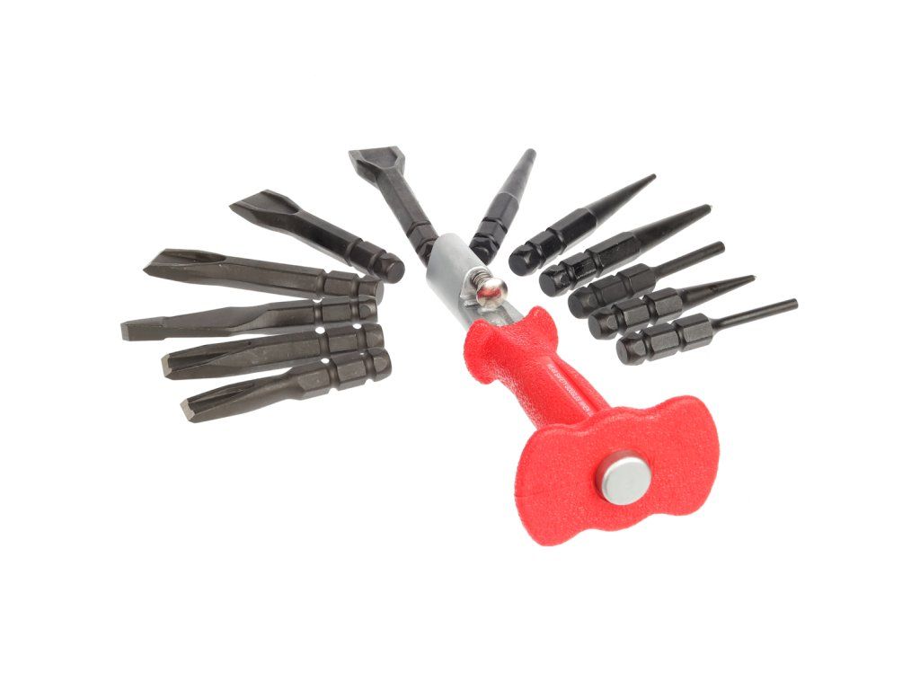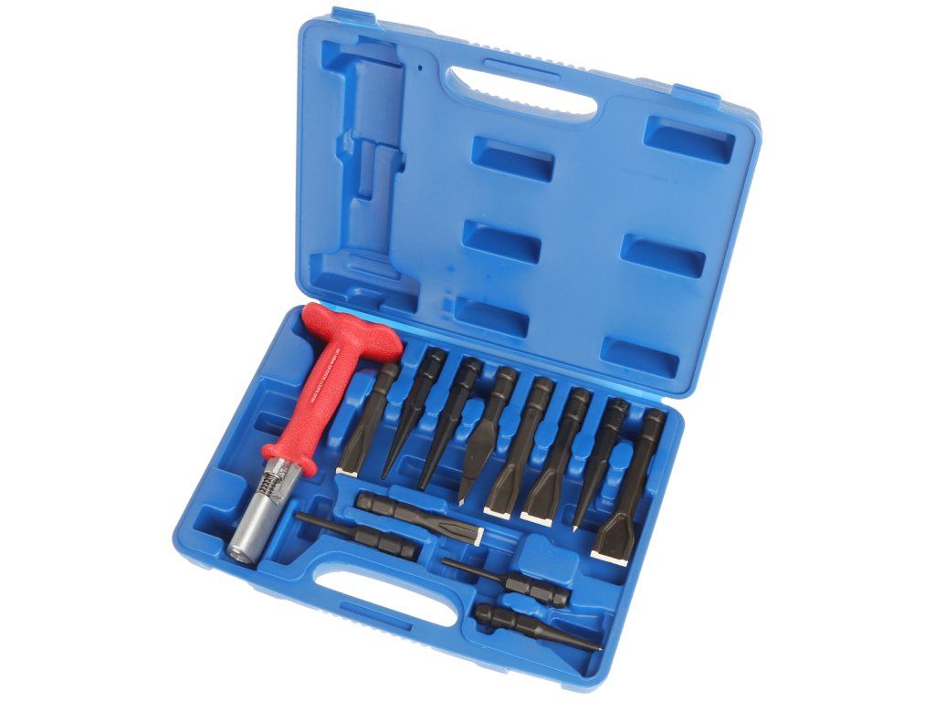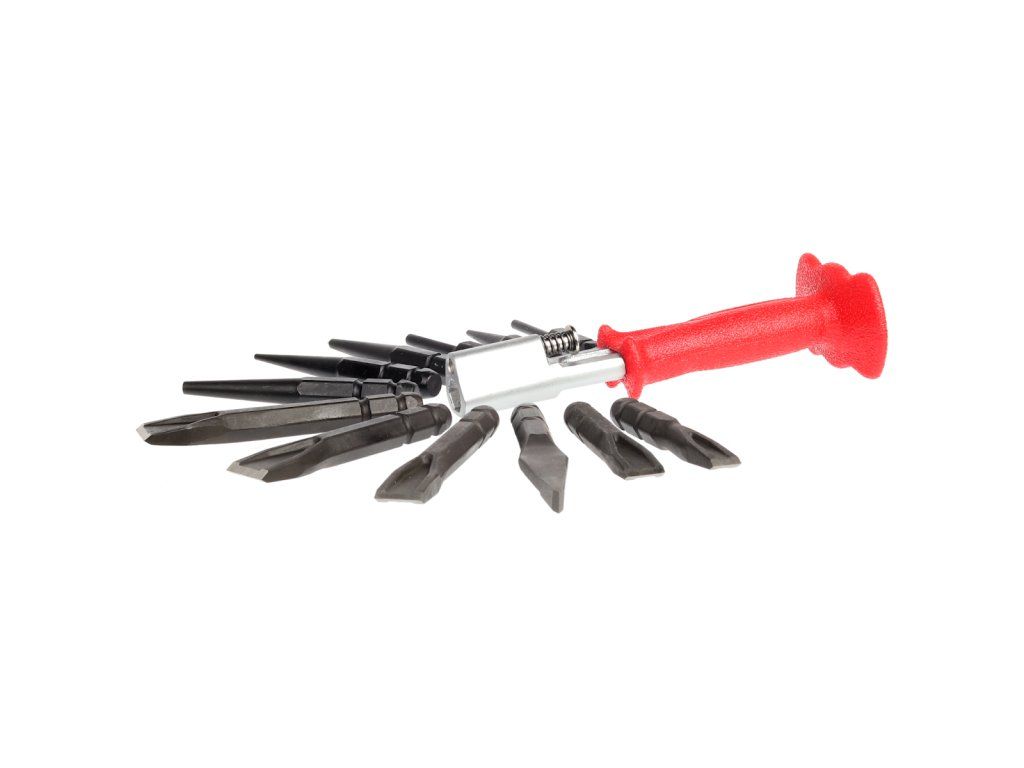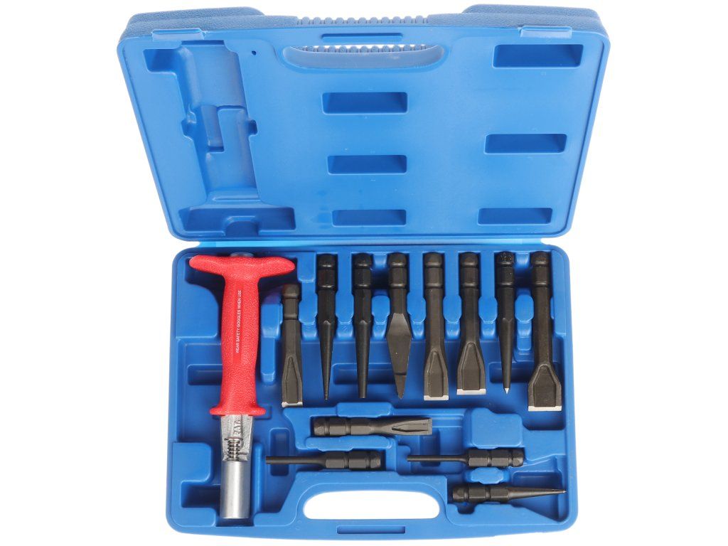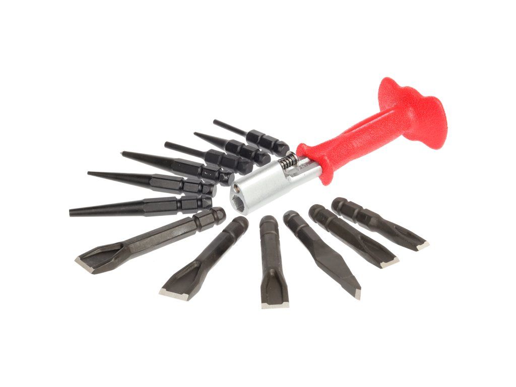 Ročaj je ergonomsko oblikovan z mislijo na varnost. Spreminjanje orodij s šesterokotnim steblom je preprosto - rahljanje z zatičem. Komplet zamenljivih konic vsebuje 5 kosov ravnih dlet širine 13, 16, 19, 22 in 26 mm, 1 kos ravnega stožčastega stožca širine 8 mm, 2 kosa stožčastih udarcev 3 in 6 mm, 2 kosa cilindričnih udarcev 5 in 6 mm ter 2 kosa sredinskih udarcev s premerom 3 in 5 mm. Material: CrV jeklo, dobavljeno lepo shranjeno v plastičnem ohišju.