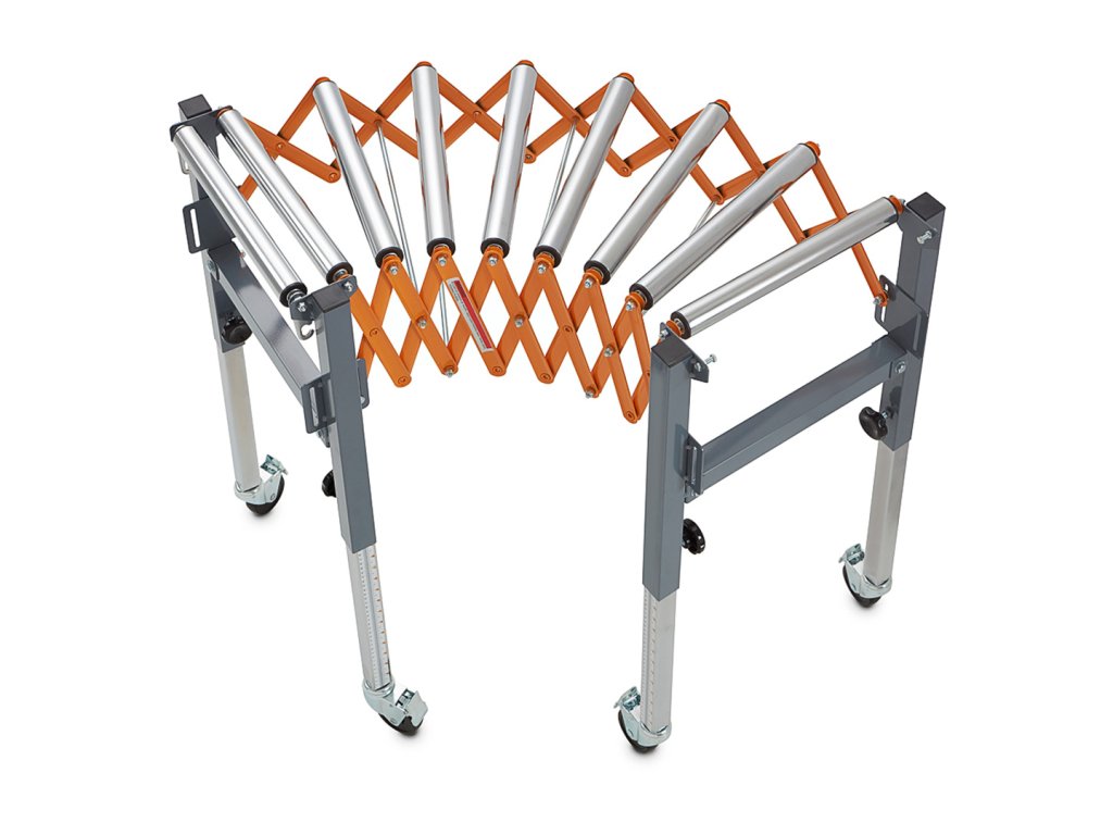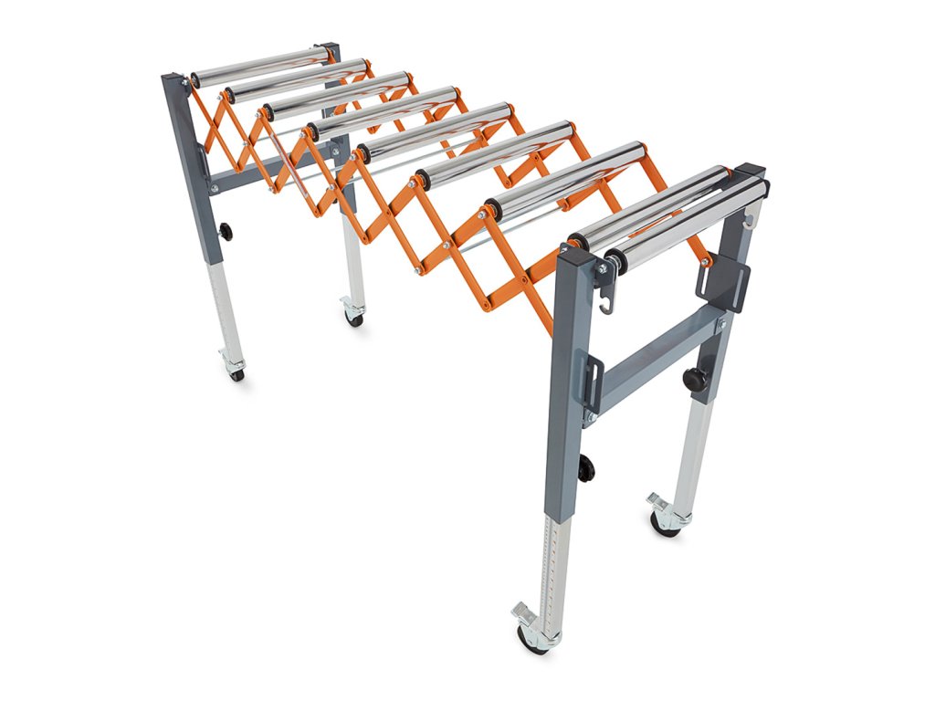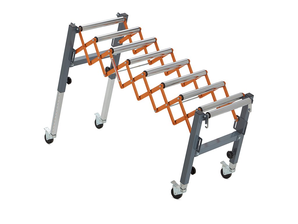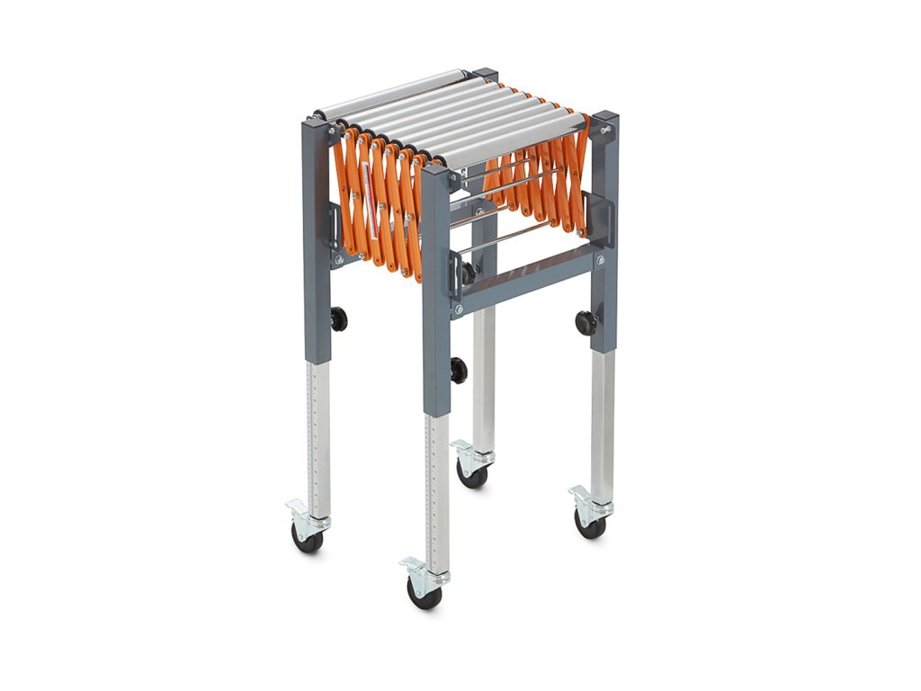 Valjčni transporter, nastavljiv po višini, znamke BORA. Lahko se upogne, dolžina in višina prilagodita, obliko pa lahko prilagodimo vašim potrebam. Zahvaljujoč integriranim kavljem je mogoče več teh pasov pritrditi drug na drugega. Kolesa se lahko zaklenejo, da se zagotovi stabilnost. Proga se lahko zloži v kompaktno velikost za boljše shranjevanje. Na teleskopskih nogah je niz enot za natančno nastavitev višine transportnega traku. Maksimalna enkratna nosilnost 136 kg.