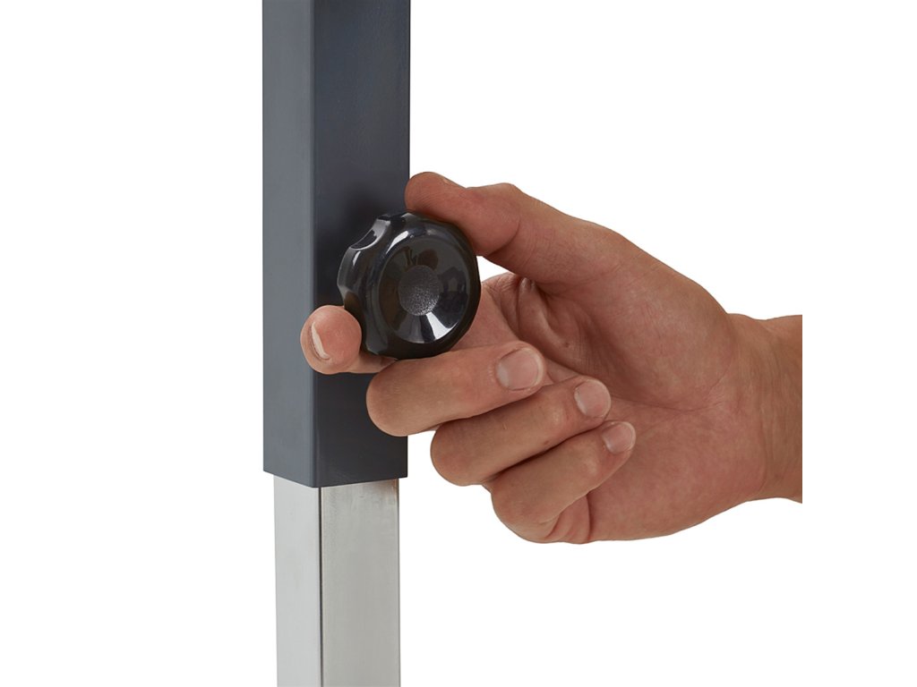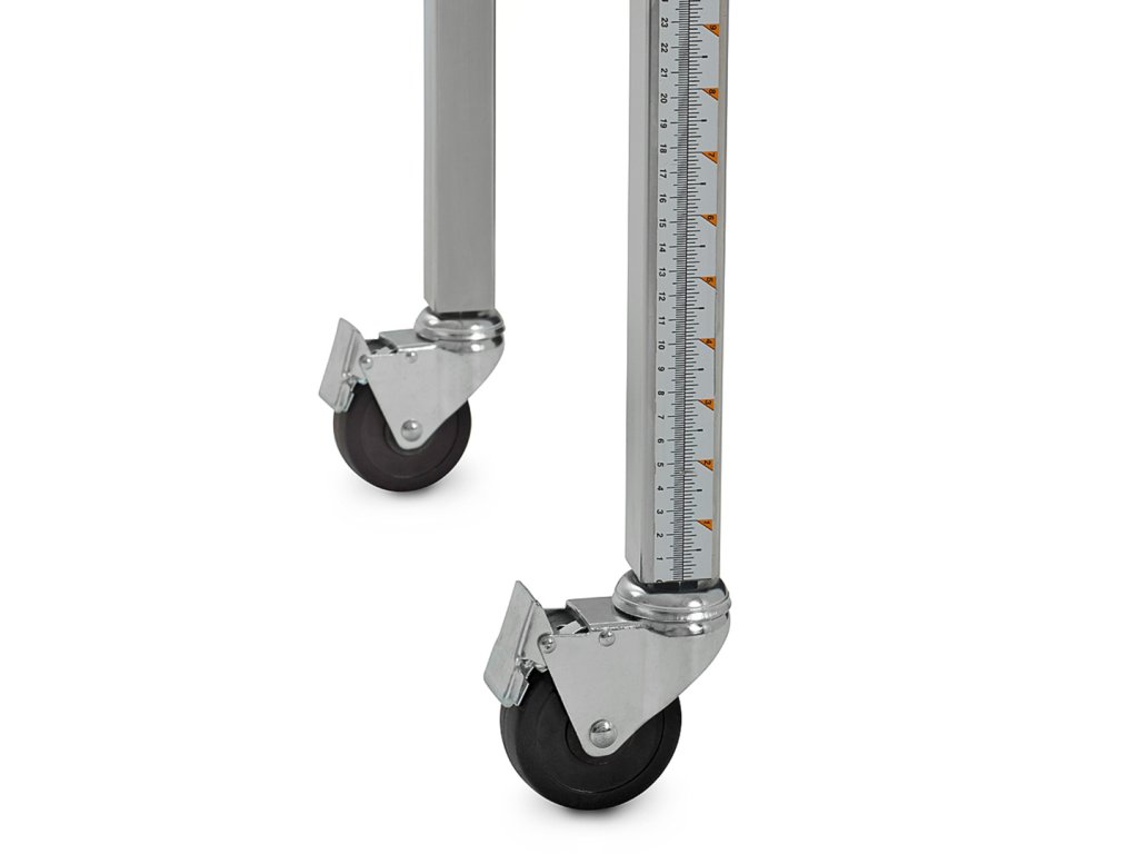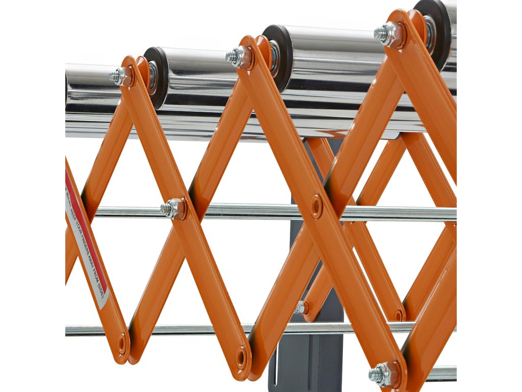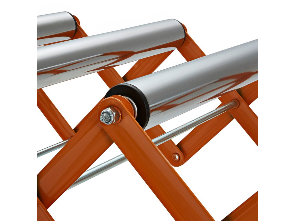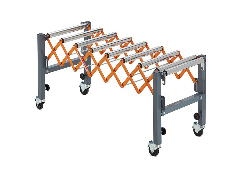 Valjčni transporter, nastavljiv po višini, znamke BORA. Lahko se upogne, dolžina in višina prilagodita, obliko pa lahko prilagodimo vašim potrebam. Zahvaljujoč integriranim kavljem je mogoče več teh pasov pritrditi drug na drugega. Kolesa se lahko zaklenejo, da se zagotovi stabilnost. Proga se lahko zloži v kompaktno velikost za boljše shranjevanje. Na teleskopskih nogah je niz enot za natančno nastavitev višine transportnega traku. Maksimalna enkratna nosilnost 136 kg.