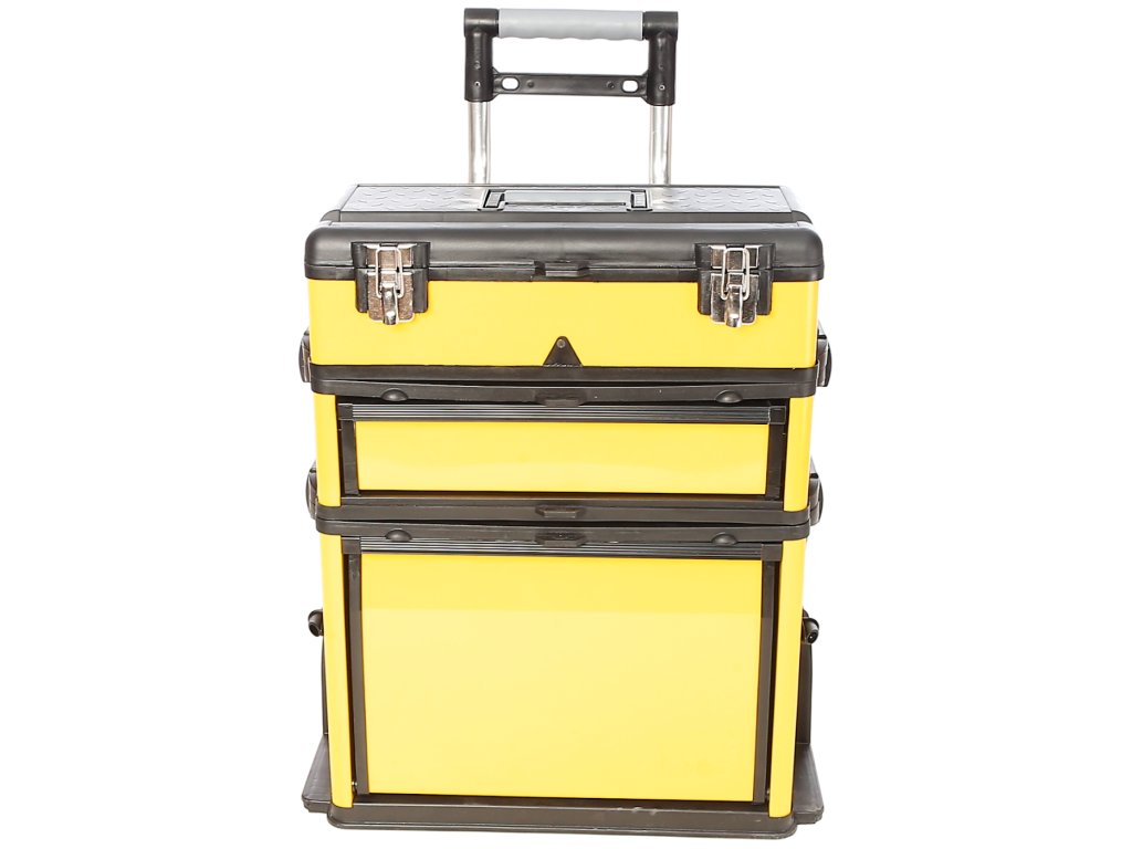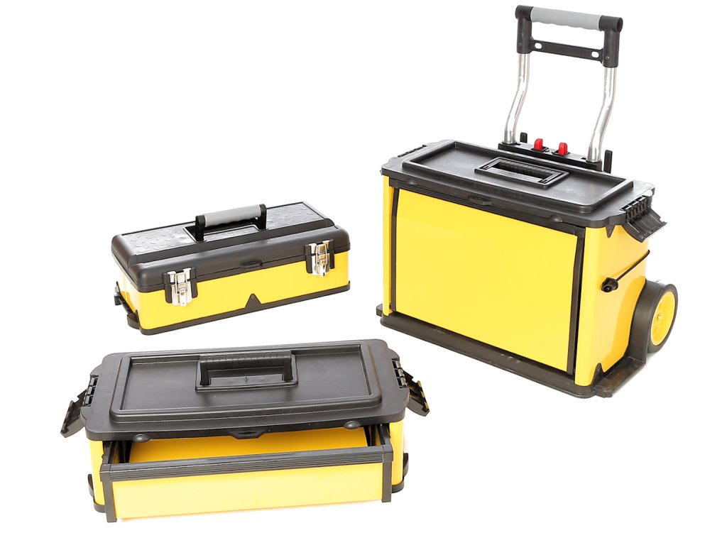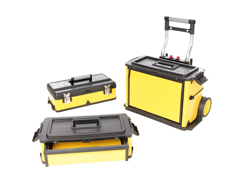 Praktična mobilna zbirka orodij s tremi ločenimi odseki. Zgornji kovček in predal se lahko ločita in uporabljata ločeno. Škatla je izdelana iz PP materiala. Izvlečni ročaj do višine 850 mm. Kolo Ø 150 mm. Skupne dimenzije 580 × 360 × 670 mm.