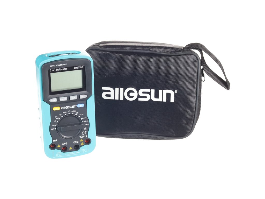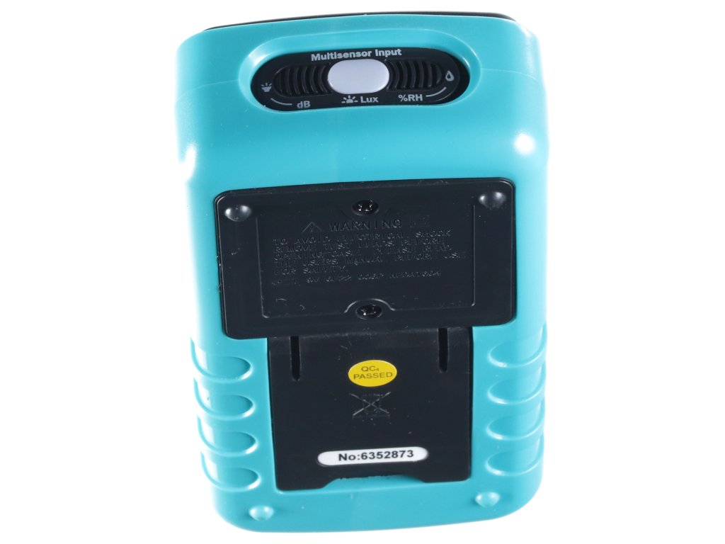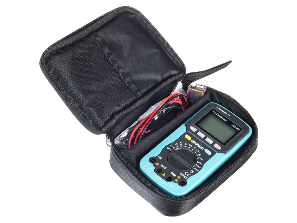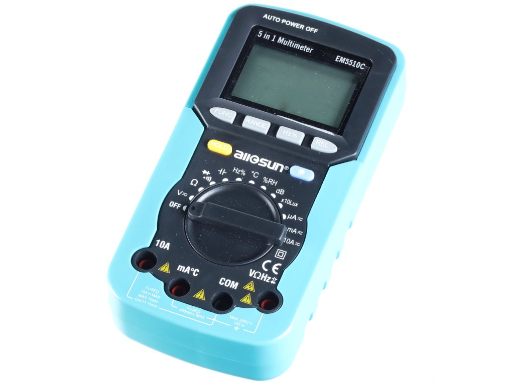 Večnamenska naprava za zelo zahtevne uporabnike - merjenje enosmerne in izmenične napetosti, enosmernega in izmeničnega toka, kapacitivnosti, frekvence, obratovalnega cikla, upora, kontinuitete, diodnega preskusa, merjenja temperature, vlažnosti, osvetlitve in hrupa. Počistite LCD zaslon z osvetlitvijo ozadja. Samodejna in ročna izbira dosega, zaščita pred preobremenitvijo, signalizacija neprekinjenosti zvočnih vodnikov in funkcija zadrževanja. Napajanje: 1 kos 9 V 6F22 baterija. enosmerna napetost 400 mV – 300 V, izmenična napetost 4 V – 300 V, enosmerni tok 400 μA – 10 A, izmenični tok 400 μA – 10 A, upor 400 Ω; – 40 MΩ, frekvenca 10 Hz – 200 kHz, kapacitivnost 4nF – 100 μF, merjenje temperature -20 – 1.000 °C, merjenje relativne vlažnosti 30% – 95%, merjenje hrupa 35 – 100 dB, osvetlitev 4,000 luksov – 40.000 luksov, preskus kontinuitete da, test diode: da. Dimenzije 165 × 85 × 47 mm. Obseg dostave: multimeter, temperaturna sonda, 2 testna vodnika s konicami.