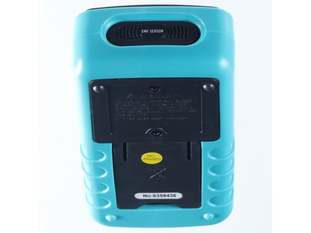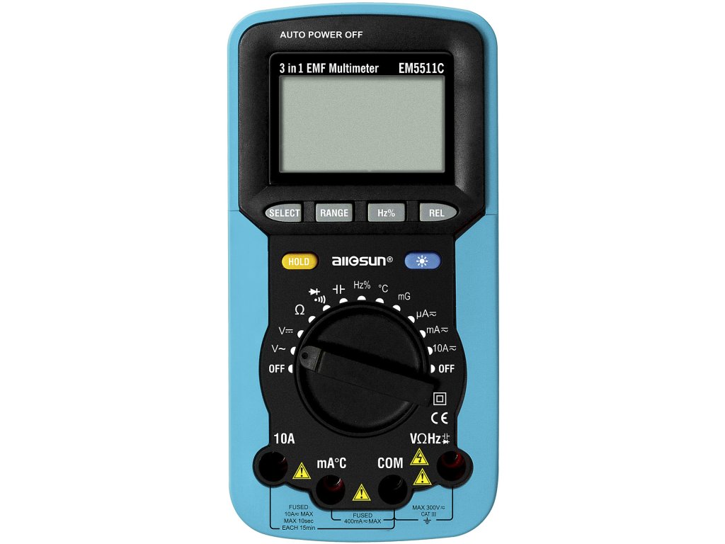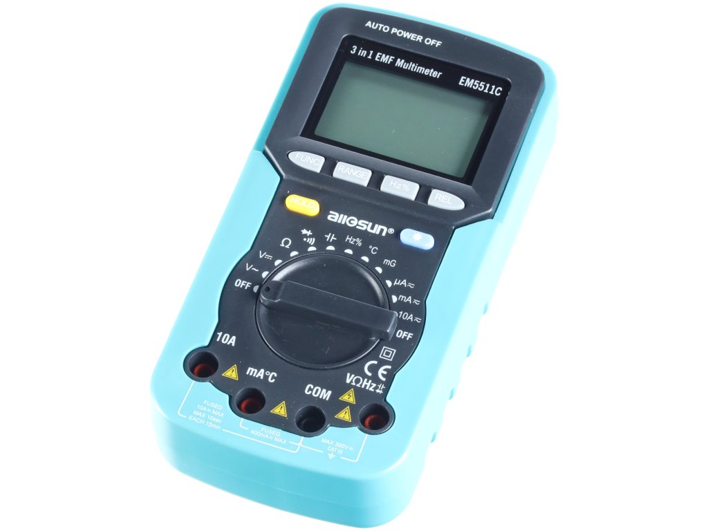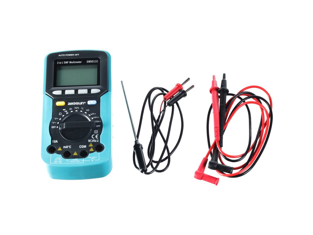 Večnamenski instrument za merjenje enosmerne in izmenične napetosti, enosmernega in izmeničnega toka, upora, kapacitivnosti, frekvence, jakosti magnetnega polja, kontinuitete, merjenja temperature. Počistite LCD zaslon z osvetlitvijo ozadja. Samodejna in ročna izbira dosega, zaščita pred preobremenitvijo, signalizacija neprekinjenosti zvočnih vodnikov in funkcija zadrževanja. Napajanje: 1 kos 9 V 6F22 baterija, enosmerna napetost 400 mV; 4 V; 40 V; 300 V; izmenična napetost 4 V; 40 V; 300 V; enosmerni tok 400 μA; 4.000 μA; 40 mA; 400 mA; 4 A; 10 A, izmenični tok 400 μA; 4.000 μA; 40 mA; 400 mA; 4 A; 10 A, upor 400 Ω; 4 kΩ; 40 kΩ; 400 kΩ; 4 MΩ; 40 MΩ, frekvenca 10 Hz – 200 kHz, kapacitivnost 4nF – 100 μF, merjenje temperature -20 – 1000 °C, merjenje jakosti magnetnega polja 400 mG; 4.000 mG, test kontinuitete, test diode. Obseg dostave: Multimeter, temperaturna sonda, 2 testna vodnika s konicami.