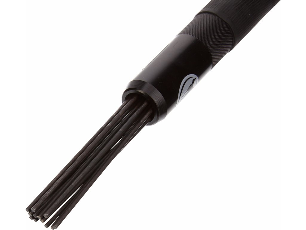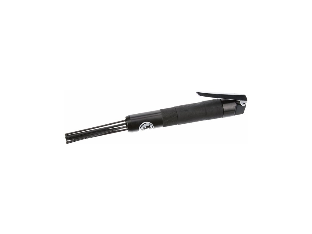 Pnevmatski odstranjevalec igel je idealno orodje za odstranjevanje rje, starih usedlin na trdnih kovinskih delih, varilne žlindre ali barve. Dolga življenjska doba 12 igel iz posebnega jekla ø 3 mm. delovna hitrost 2.800 udarcev/min. z gibom 24 mm, poraba zraka 113,3 l/min; tlak 6.3 bar; 1/4" povezava (hitra spojna bradavica ni priložena).