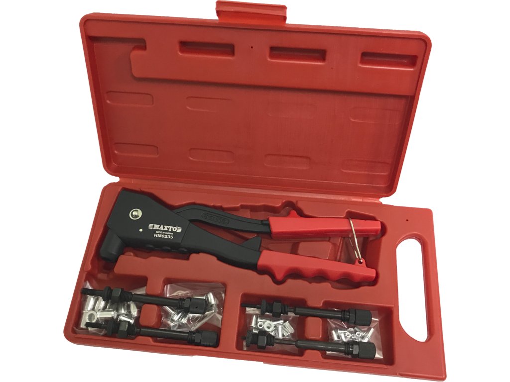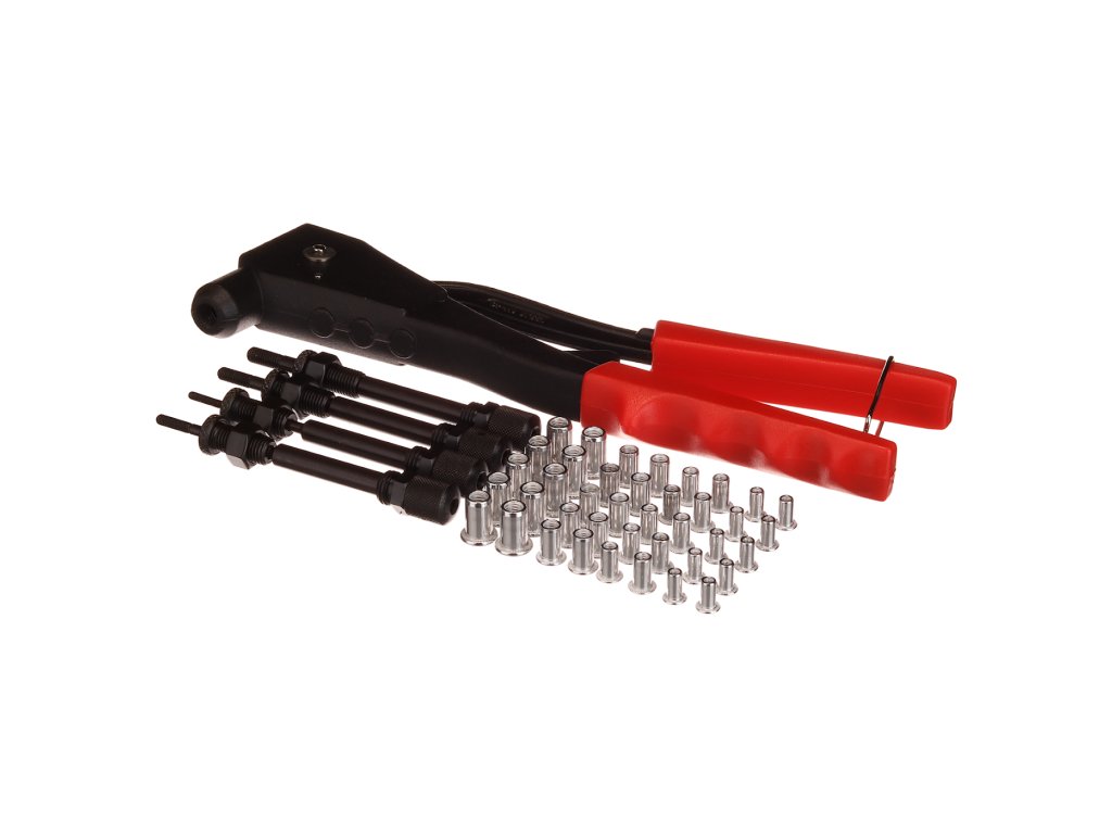Ročne klešče za kovičke. V embalaži pritrditve na matico M3; M4; M5; M6 in 40 slepih matic zakovic. Jasno shranjeno v plastični škatli.