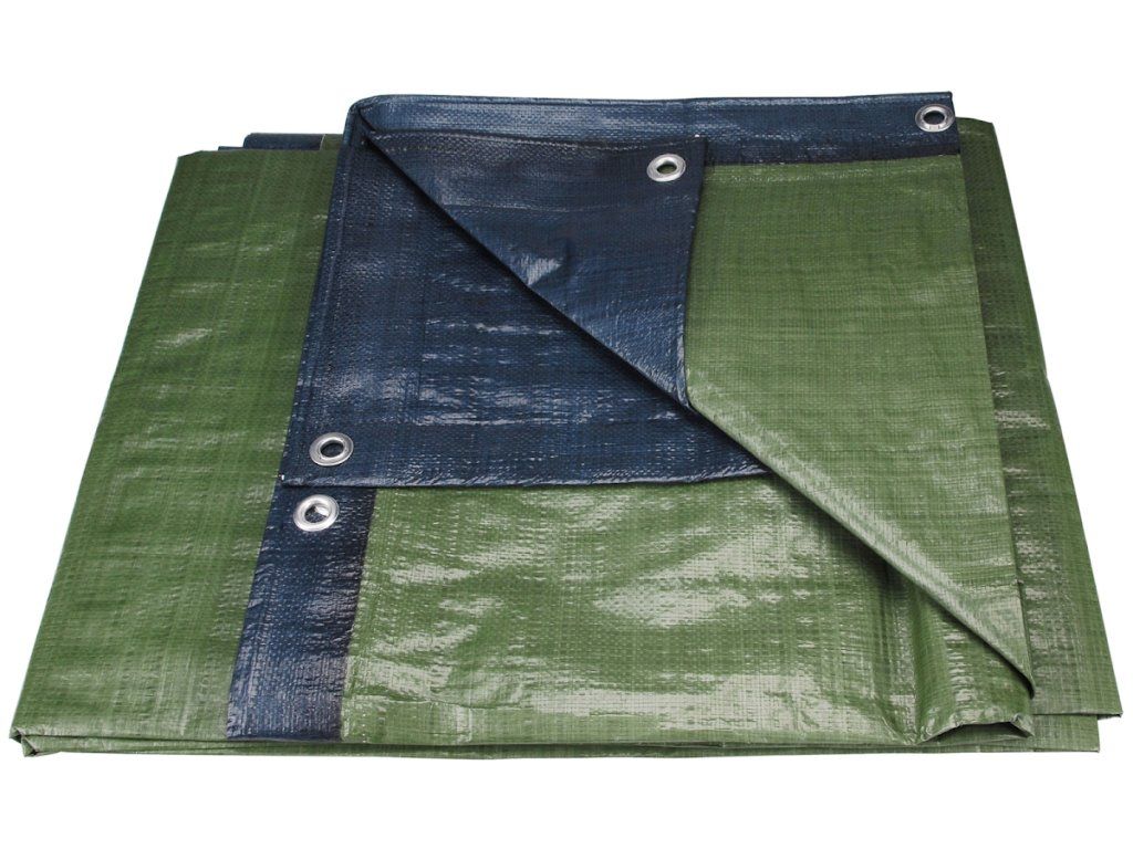 Vodoodporna, dvobarvna PE ponjava, težka 150 g/m², modra in zelena, je opremljena z aluminijastimi očesci za pritrditev po obodu.