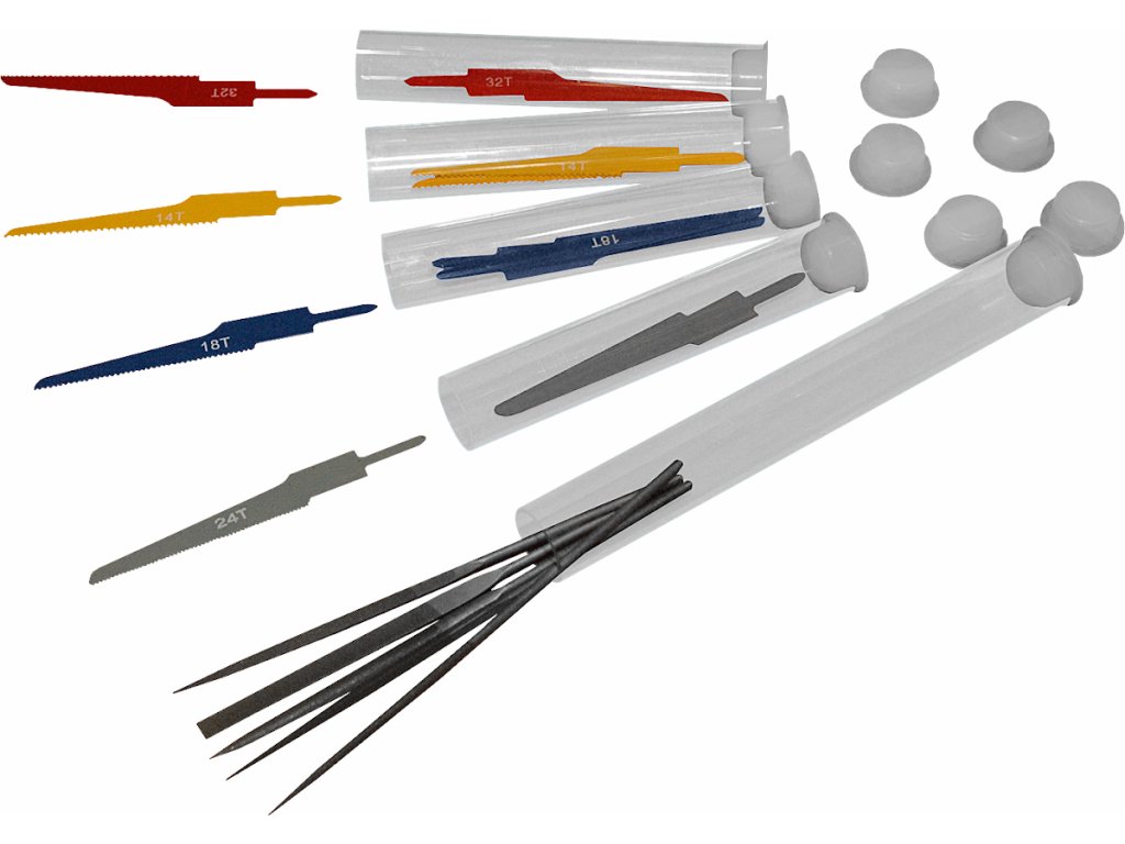 Žaga je primerna za razrez jekla do max. 1,6 mm, lesa do max. 16 mm, Al, plastike, steklenih vlaken in podobnih materialov do max. 3,2 mm. Delovni tlak 6,2 bara, poraba zraka 170 l/min, hitrost 9.000 nihanj/min, hod 10 mm, vibracije 16 m/s². Paket vsebuje 5 datotek v obliki in 3 žage liste: 14T, 18T, 24T, 32T. Pakirano lepo v plastičnem ohišju.