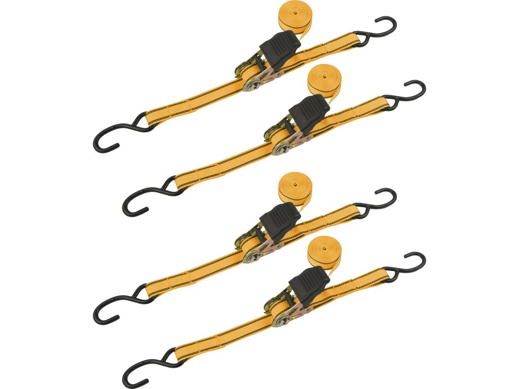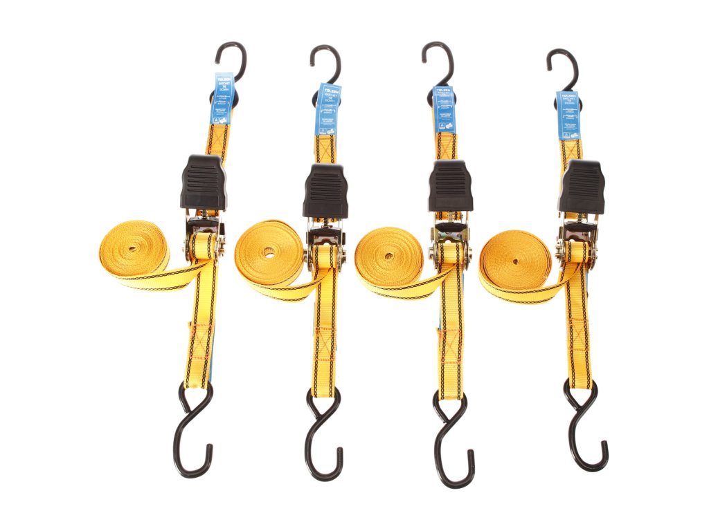 Štiridelni komplet kompresijskih trakov. Jeklo, pocinkani zaskočnik. Dolžina pasu 5 m, širina 25 mm, vpenjalna zmogljivost 225 kg, končna trdnost 450 kg.