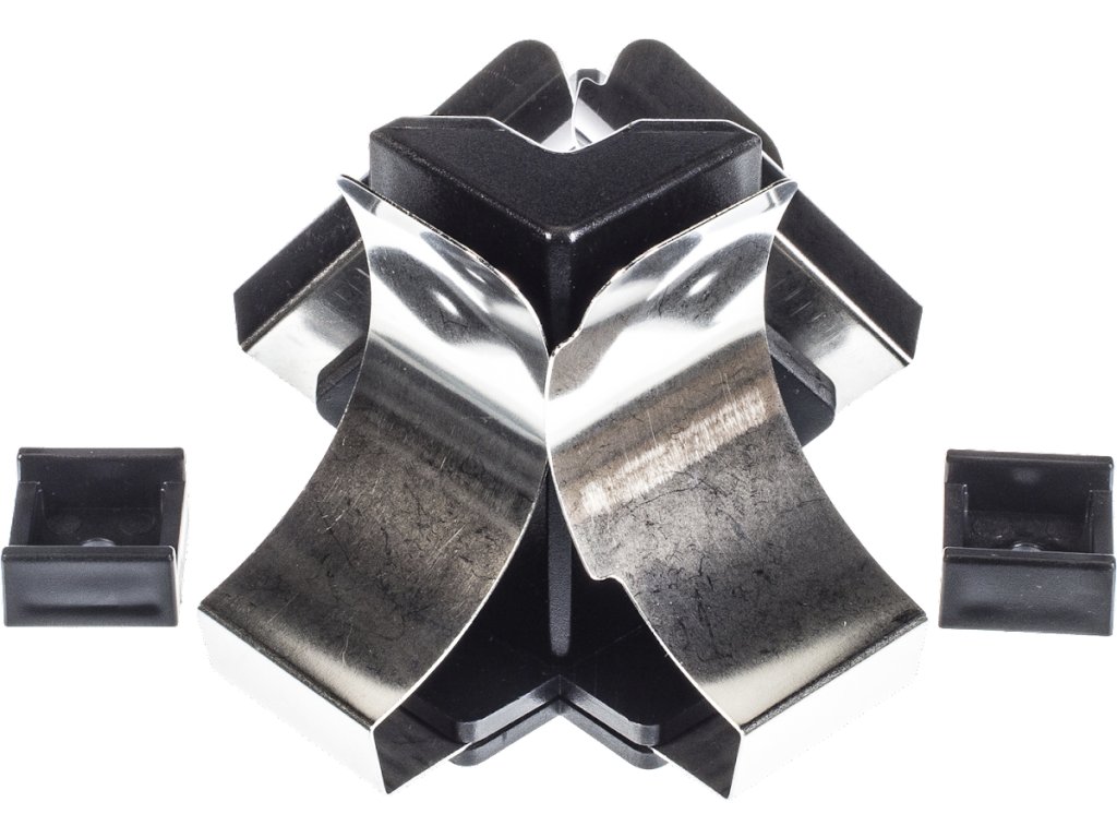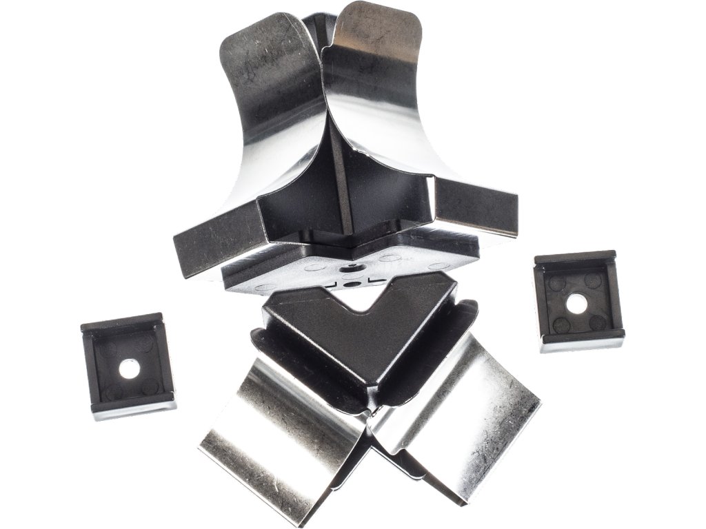 Priročen pomočnik za montažo, spajanje in lepljenje pravokotnih spojev do debeline materiala do debeline materiala do 19 mm. Plastično ohišje višine 85 mm in fleksibilne čeljusti širine 45 mm iz nerjavečega jekla.