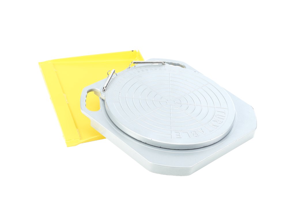 Ciljna vrtljiva miza je pomembno orodje za prilagajanje geometrije sprednje osi. Zmanjša upor pnevmatike na tla, ko je volan obrnjen. Gramofon je opremljen z orientacijsko lestvico. Material: jeklo; dimenzije 400 × 400 × 50 mm; nosilnost 2 T.
