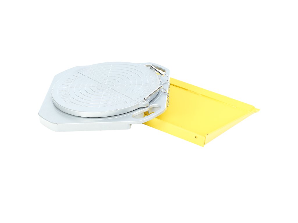 Ciljna vrtljiva miza je pomembno orodje za prilagajanje geometrije sprednje osi. Zmanjša upor pnevmatike na tla, ko je volan obrnjen. Gramofon je opremljen z orientacijsko lestvico. Material: jeklo; dimenzije 400 × 400 × 50 mm; nosilnost 2 T, 2 kosa.