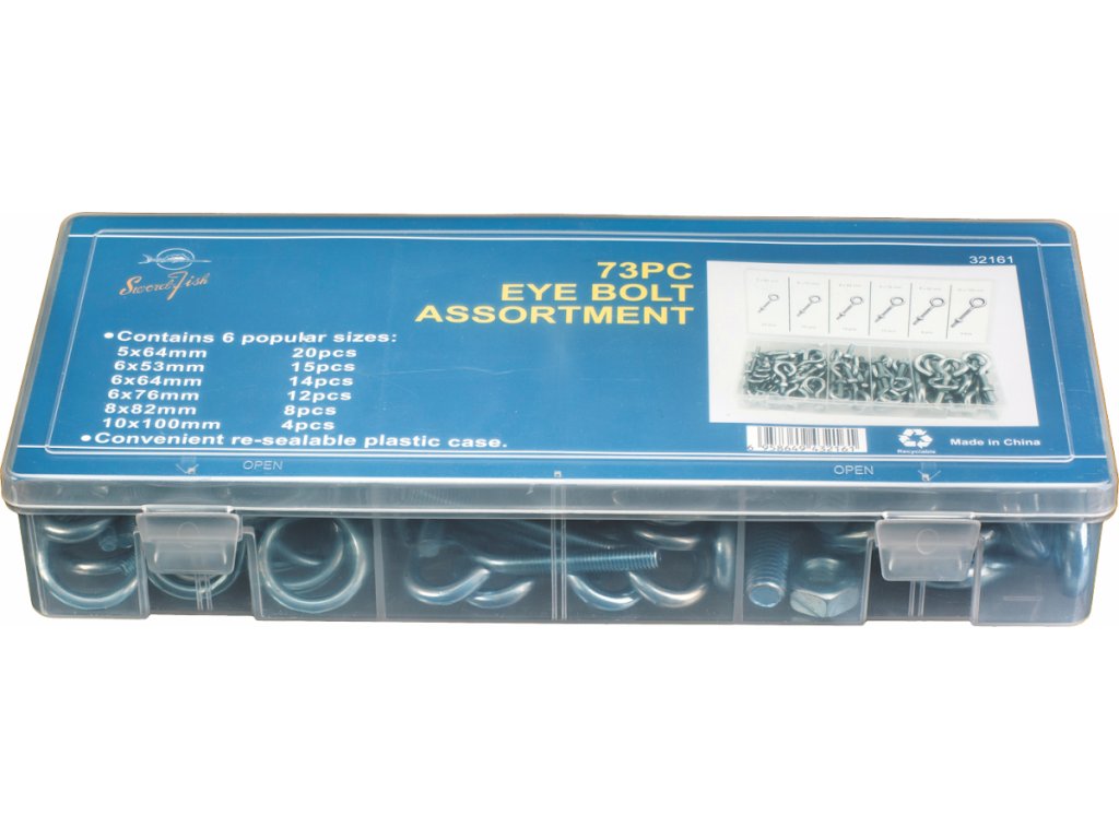 Vsebuje zaprte, nevarjene ušesce iz pocinkanega jekla z metričnim navojem in matico. Velikosti mrežnega očesa 5 × 64 mm (20 kosov), 6 × 53 mm (15 kosov), 6 × 64 mm (14 kosov), 6 × 76 mm (12 kosov), 8 × 82 mm (8 kosov) in 10 × 100 mm (4 kos). Dobavljeno v plastičnem ohišju.