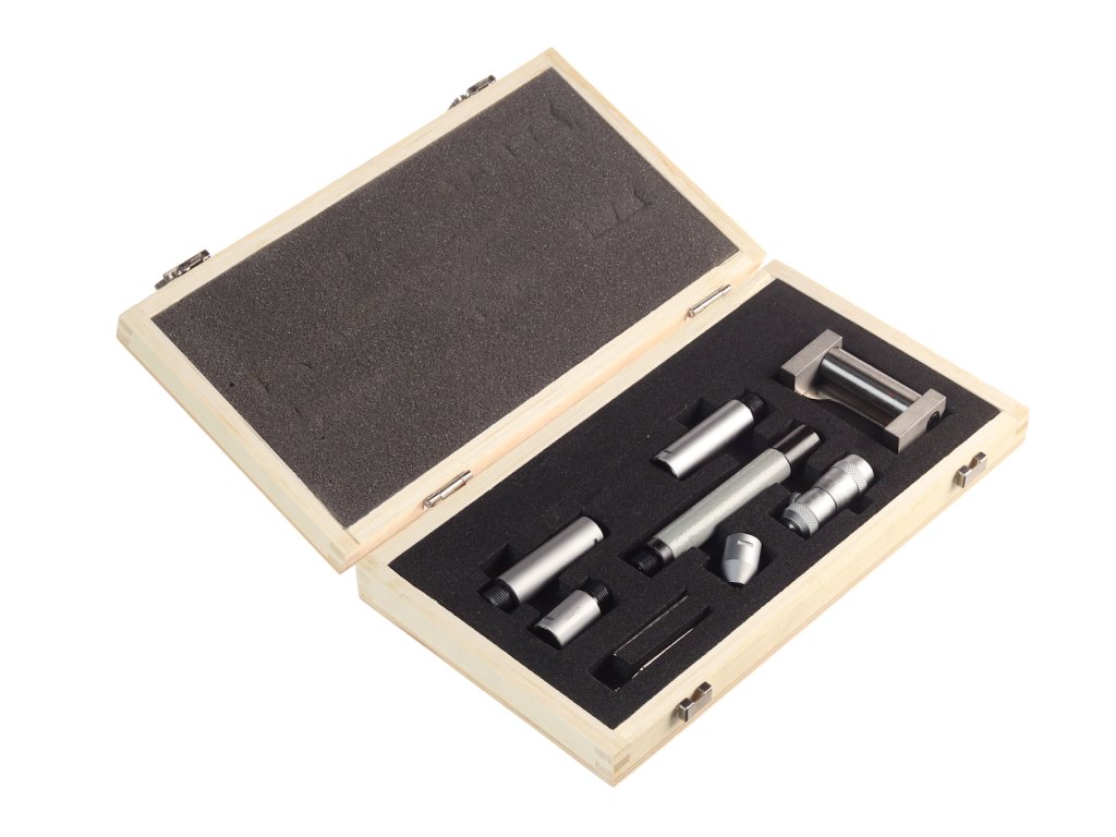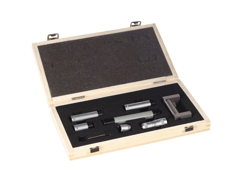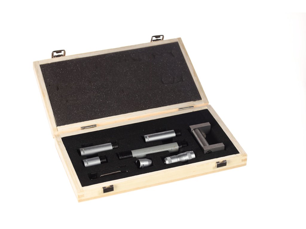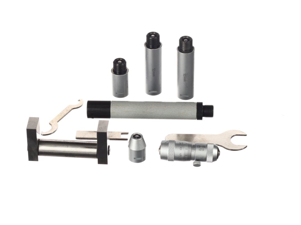 Zagotavlja širok spekter meritev v kombinaciji s priloženimi priključki, glavo mikrometra in osnovnim merilnikom za nastavitev nič. Natančnost 0,01 mm. Domet 50 – 300 mm. Komplet vključuje: S-ključ, osnovni merilnik 50 mm, priključke in glavo mikrometra 50 - 63 mm. Dobavljeno v leseni škatli.