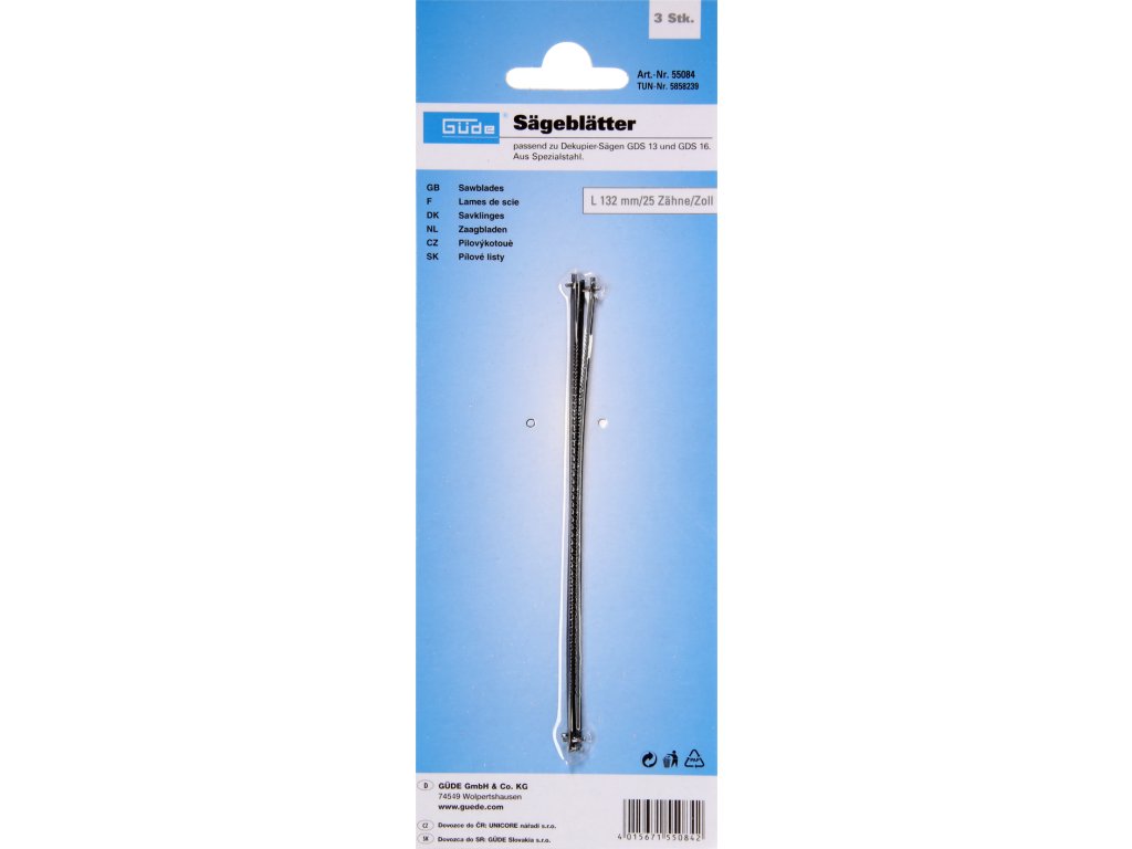 Komplet 3 listov jeklenih žag, namenjen rezanju mehkega lesa/trdega lesa, vezanega lesa, stavbnega pohištva in vlaknene plošče, plastike, ometa itd. 25 zob na palec, dolžine 132 mm.