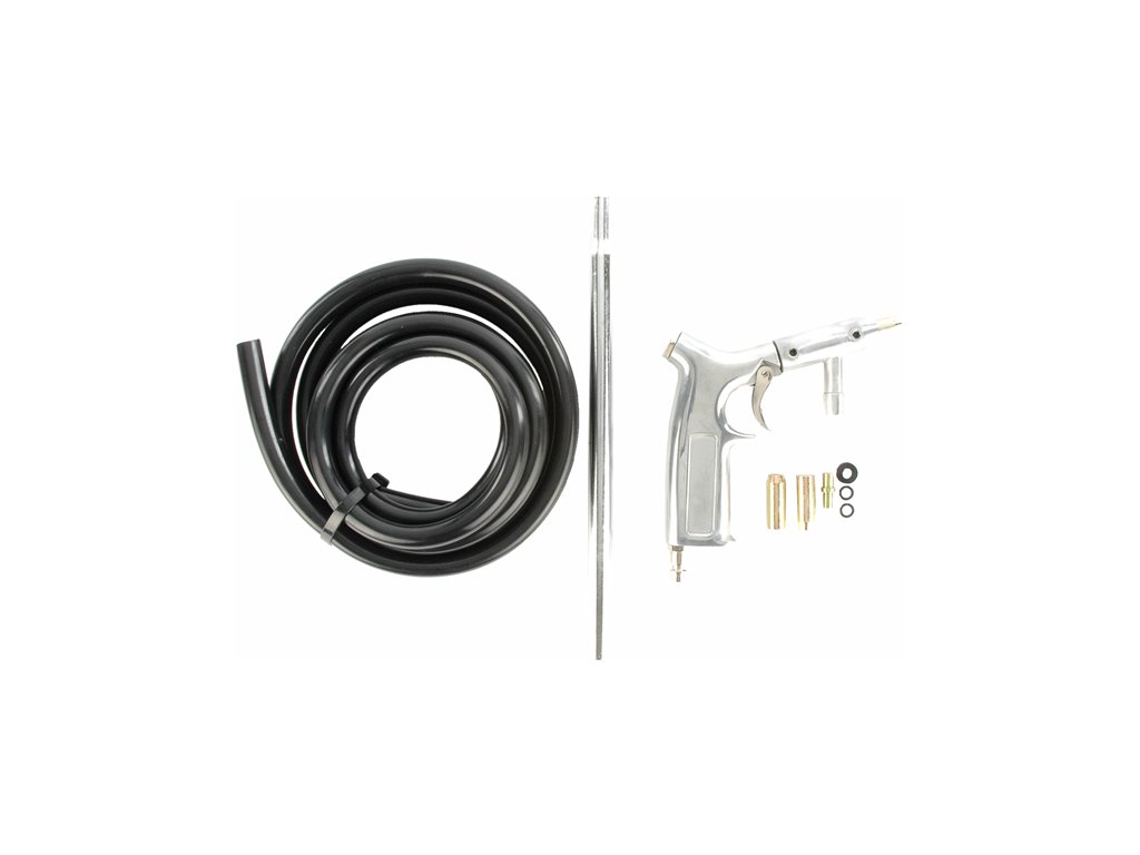 Dostava vključuje: pištolo, 2 kos šob dia. 4,5 mm, 2 kos šob dia. 6 mm, sesalna cev, pritrditev za sesanje peska. Tehnični parametri: Zračni tlak: 0,5 – 1 MPa Poraba zraka: od 200 l/min Velikost zrn peska: približno 1 mm