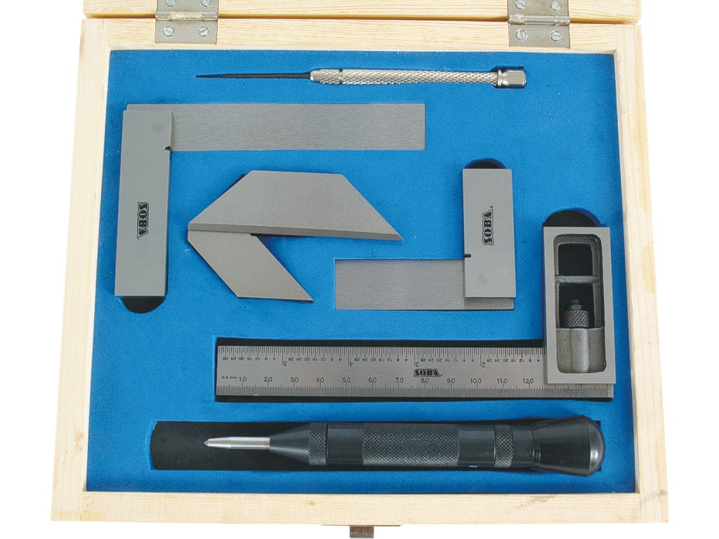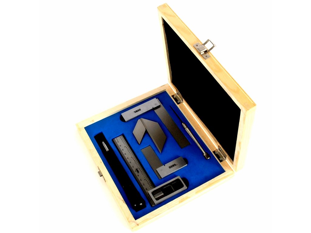 Komplet vključuje prizmatični ravnilo za določanje središča hloda, avtomatski Profi udarec, risalno iglo, nastavljiv kvadrat s palcem in metričnim ravnilom 150 mm, 2 fiksna kvadrata nožev 100 mm in 50 mm.
