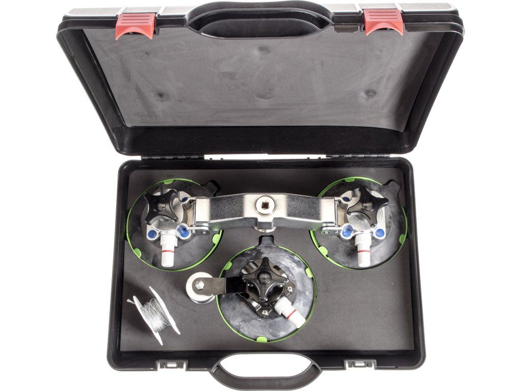 Vključuje 1 enojno sesalno posodo z vodilnim valjčkom za žarilno nitko in 1 dvojno sesalno posodo z navijalni valjček, ki ga poganja zaskočnik. Paket vključuje tuljavo z vrvico za rezanje vetrobranskega stekla. Vse je shranjeno v plastičnem ohišju.