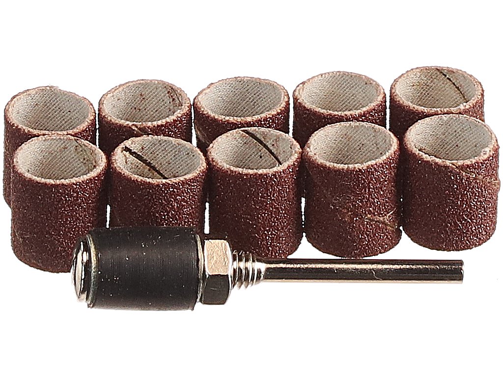 Komplet vsebuje 10 kosov brusilnih rokavov s premerom 9 mm in gumijasto prijemalo na steblu. Še posebej primerna za brušenje oblik lesa.